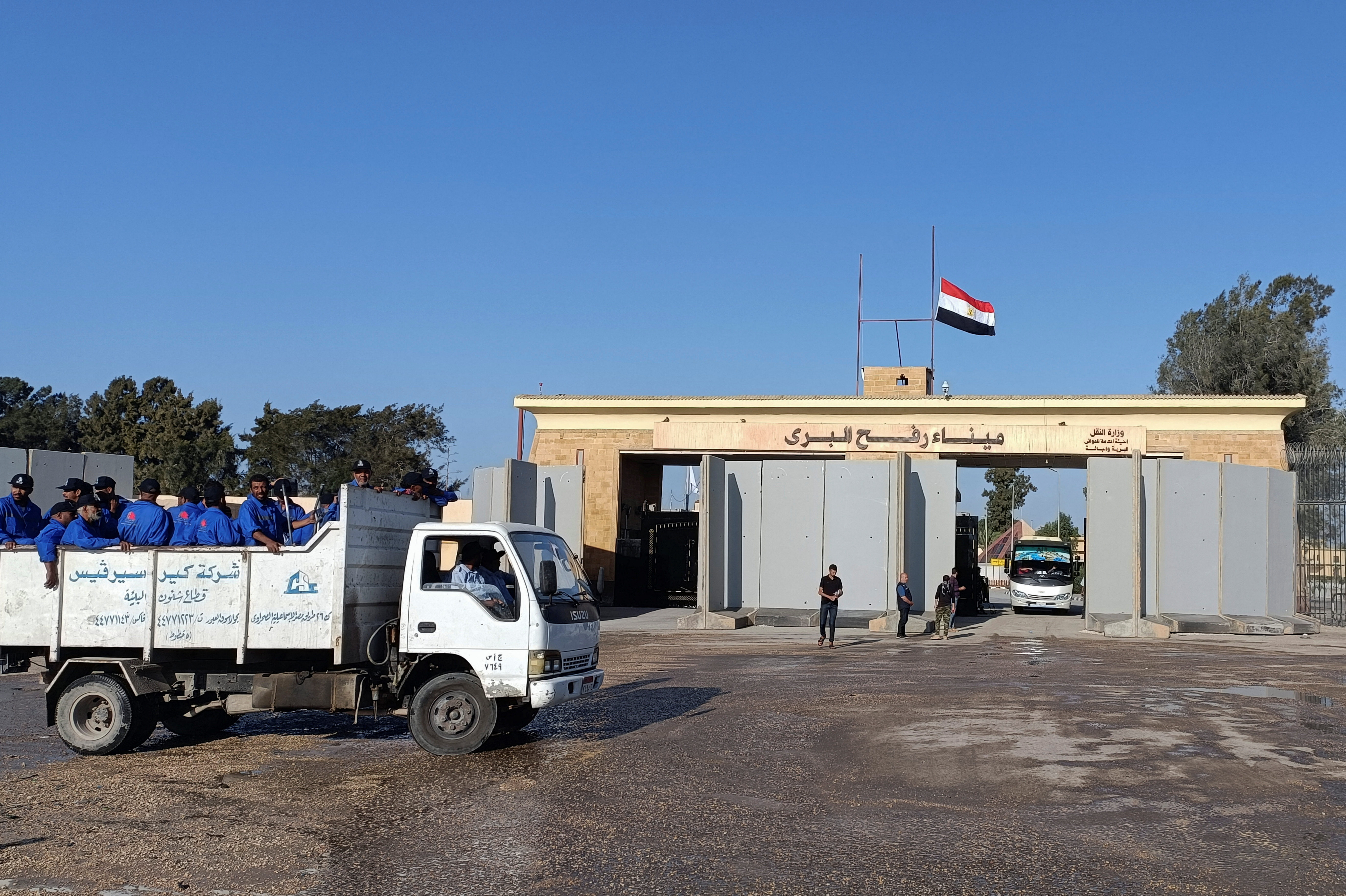 Οι Αιγύπτιοι υπάλληλοι καθαριότητας ετοιμάζουν την περιοχή εν όψει του ανοίγματος της Ράφα - Φωτ.: REUTERS/Stringer.