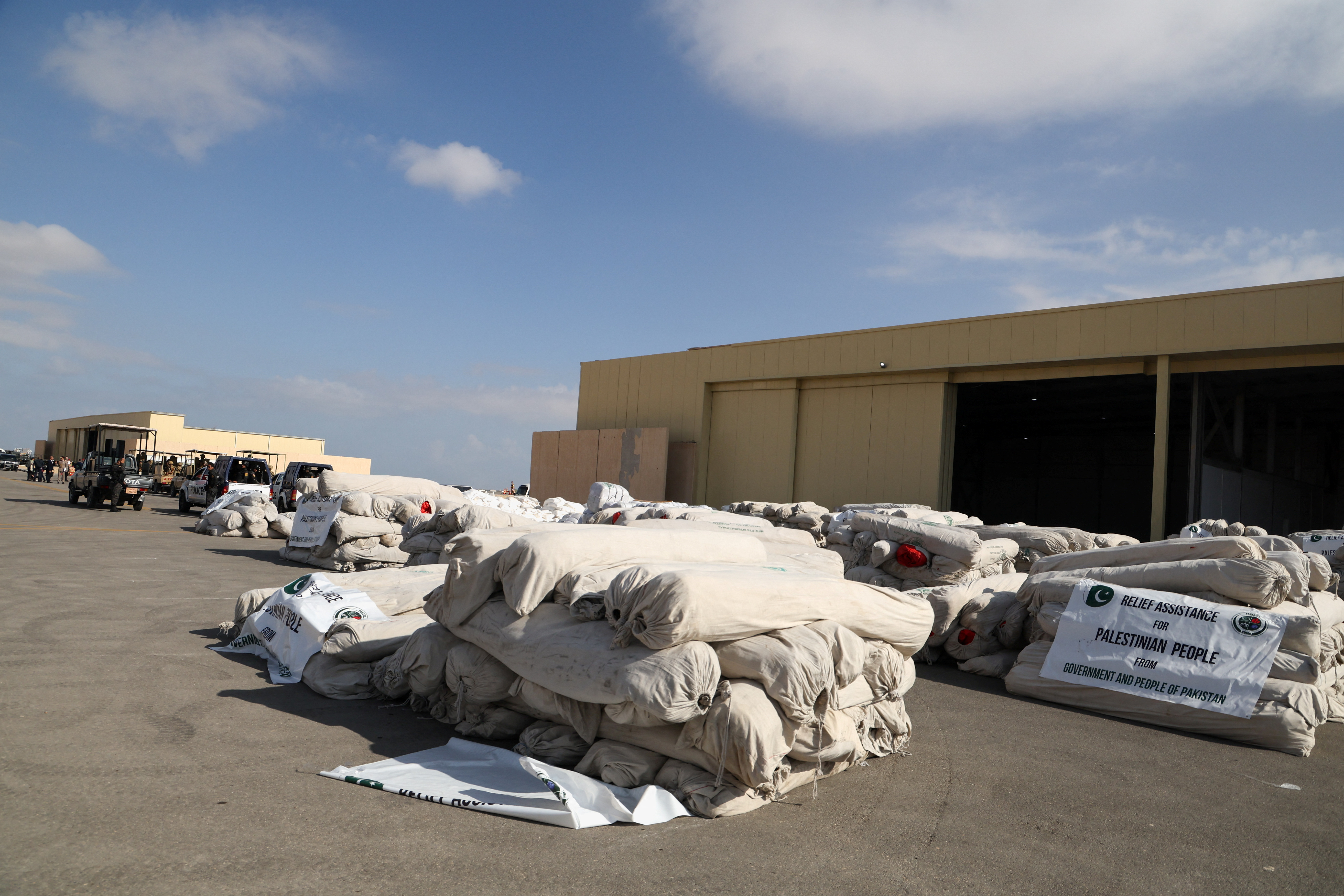 Φορτία με τρόφιμα, φάρμακα, καθαριστές νερού, προϊόντα υγιεινής και κουβέρτες συσσωρεύονται τις τελευταίες ημέρες στην περιοχή του Σινά της Αιγύπτου στο αεροδρόμιο El Arish, το οποίο άνοιξε ακόμη και έναν επιπλέον διάδρομο προσγείωσης για να αντεπεξέλθει στις αποστολές.