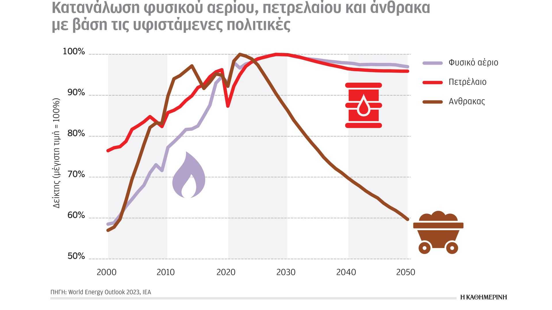 Με βάση τις υφιστάμενες πολιτικές των διαφόρων κρατών, τα ορυκτά καύσιμα κορυφώνουν την κατανάλωσή τους έως το 2030 και στη συνέχεια μειώνονται. Η μεγαλύτερη πτώση (-60%) αφορά τον άνθρακα, ο οποίος το 2050 φτάνει στα επίπεδα του 2000. Φυσικό αέριο και πετρέλαιο παραμένουν σε ισχυρά υψηλές τιμές έως το 2050 (περίπου στο 95% της κορύφωσης).