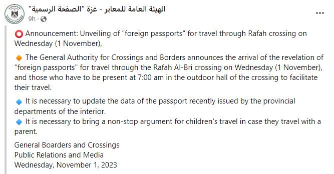 Η συνοριακή αρχή της Γάζας δημοσίευσε μια λίστα με περισσότερους από 500 ξένους πολίτες και άτομα με διπλή υπηκοότητα, καλώντας τους να κατευθυνθούν προς το πέρασμα της Ράφα το πρωί της Τετάρτης στις 7 το πρωί, για να φύγουν από τη λωρίδα.
