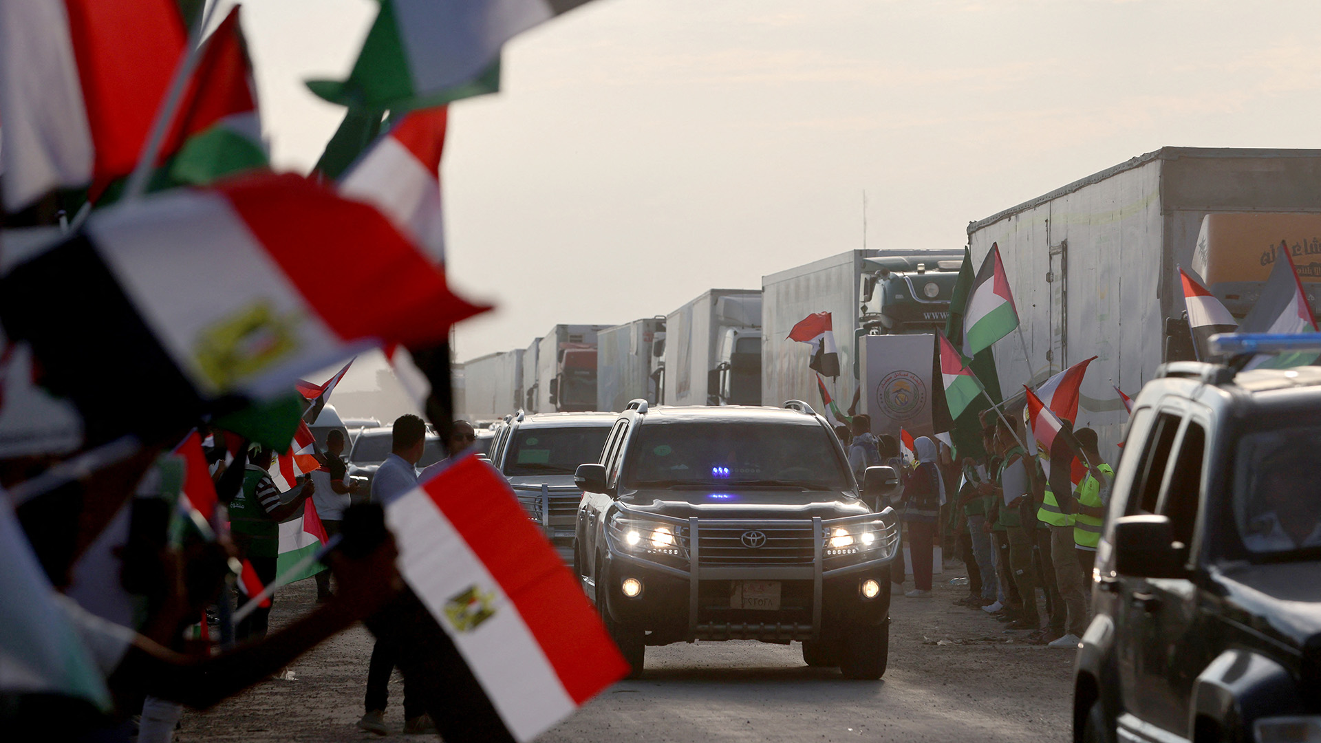 Την Τρίτη τα Ηνωμένα Εθνη ανέφεραν ότι 59 φορτηγά που μετέφεραν νερό, τρόφιμα και φάρμακα εισήλθαν στη Γάζα μέσω της Ράφα. Επρόκειτο για τη μεγαλύτερη αυτοκινητοπομπή από τότε που άρχισε εκ νέου η παράδοση ανθρωπιστικής βοήθειας στις 21 Οκτωβρίου. Στόχο αποτελεί να φτάνουν τα 100 φορτηγά την ημέρα μέχρι το τέλος της εβδομάδας. Σημειώνεται ότι η ροή πριν από τον αποκλεισμό που επέβαλε το Ισραήλ περιελάμβανε 500 με 800 φορτηγά βοήθειας ημερησίως, γεγονός που αναδεικνύει το μέγεθος της ανθρωπιστικής καταστροφής.