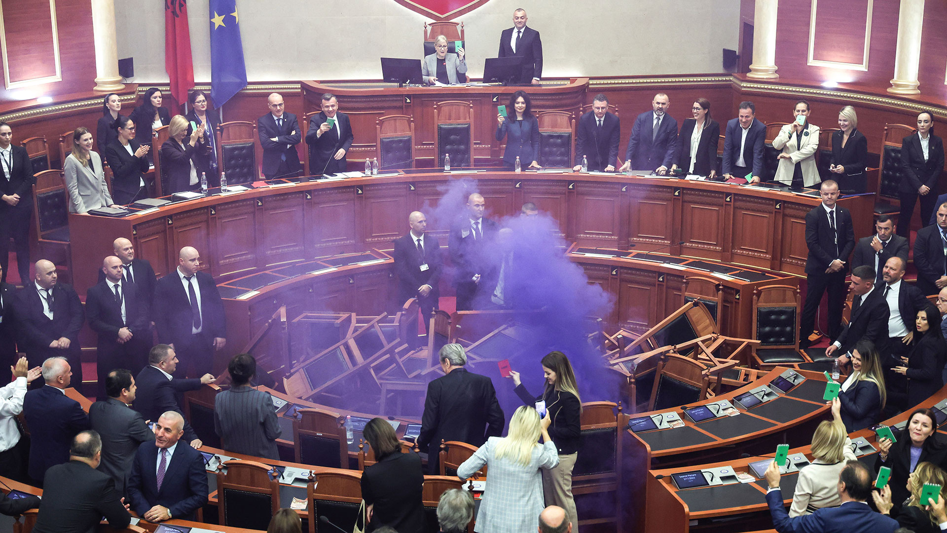 Οι βουλευτές του Δημοκρατικού κόμματος εμπόδισαν τους Σοσιαλιστές του πρωθυπουργού Εντι Ράμα να καθίσουν στις θέσεις τους, στοιβάζοντας τις καρέκλες στο κέντρο της αίθουσας, ενώ άναψαν καπνογόνα και σε μερικές περιπτώσεις έσπρωξαν βουλευτές της συμπολίτευσης.