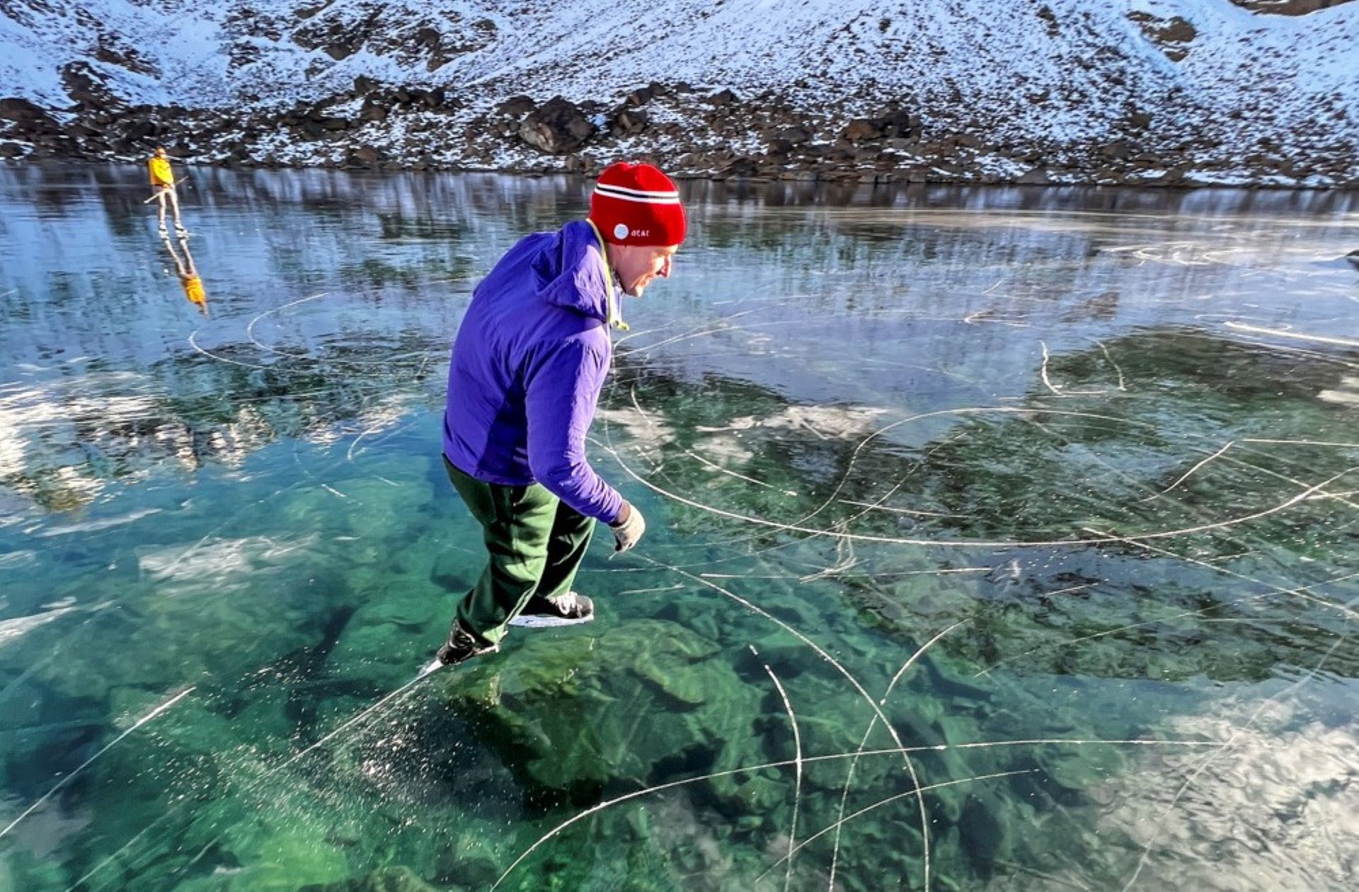 Αν το πατινάζ πάνω σε μια παγωμένη αλπική λίμνη που περιβάλλεται από ορεινούς όγκους είναι ούτως ή άλλως απόκοσμα επιβλητικό, το πατινάζ πάνω σε μια διάφανη επιφάνεια με τον βυθό της λίμνης σε πλήρη θέα, είναι μια εμπειρία που προκαλεί δέος.