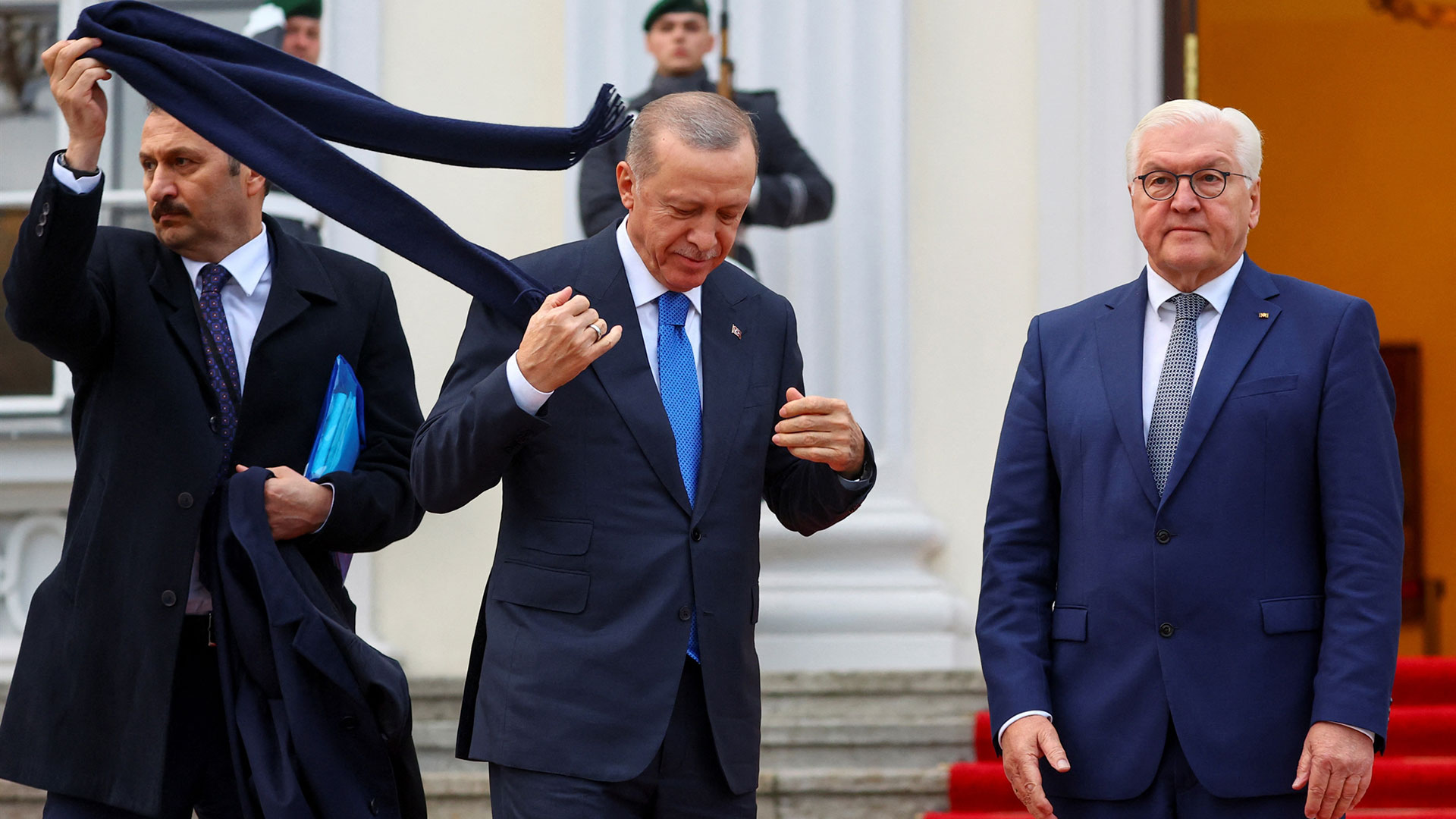 «Συνάντηση με τον Τύπο» προανήγγειλε η γερμανική κυβέρνηση, προκειμένου να παρακάμψει μια δυσάρεστη συνέντευξη Τύπου που θα μπορούσε να τιναχτεί στον αέρα από δύσκολες ερωτήσεις προς τους δύο ηγέτες. To αεροσκάφος του Ερντογάν προσγειώθηκε στο στρατιωτικό τμήμα του αεροδρομίου Σένεφελντ στο Βερολίνο και αρχικά η αυτοκινητοπομπή του κατευθύνθηκε προς το προεδρικό μέγαρο για την –αμήχανη αν κρίνουμε από τις αγέλαστες φωτογραφίες– συνάντηση με τον πρόεδρο, Φρανκ Βάλτερ Σταϊνμάγερ, προτού μεταβεί στην καγκελαρία για το δείπνο με τον καγκελάριο. Δεν έλειψαν οι φωνές που ζητούσαν επίμονα αναβολή της επίσκεψης, αφού ο Ερντογάν έχει επανειλημμένως χαρακτηρίσει το Ισραήλ κράτος-τρομοκράτη με φασιστικές έξεις, μια ρητορική την οποία ο καγκελάριος Σολτς αποκάλεσε «παράλογη». Ειδικά η κουρδική κοινότητα, το Κεντρικό Ισραηλιτικό Συμβούλιο και στελέχη όλων των κομμάτων, από την Αριστερά έως τους Πράσινους, αποδοκίμασαν τις πρόσφατες δηλώσεις του. «Περιμένω σαφήνεια από τον καγκελάριο Σολτς» κατά τις συνομιλίες με τον Ερντογάν, είπε ο σοσιαλδημοκράτης Μίχαελ Ροτ, επικεφαλής της επιτροπής Εξωτερικών Υποθέσεων στη γερμανική Βουλή.