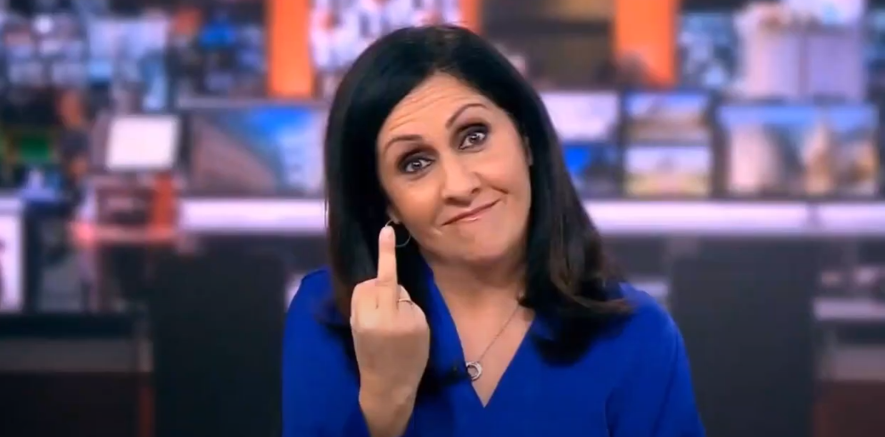 Χθες Τετάρτη, η Μάριαμ Μοσίρι, μία από τις βασικές παρουσιάστριες του BBC News, εμφανίστηκε στην έναρξη του μεσημεριανού δελτίου του BBC News, με σηκωμένο το μεσαίο δάχτυλο και με τα φρύδια της ανασηκωμένα, αμέσως μετά το τέλος του σήματος για την έναρξη της εκπομπής.