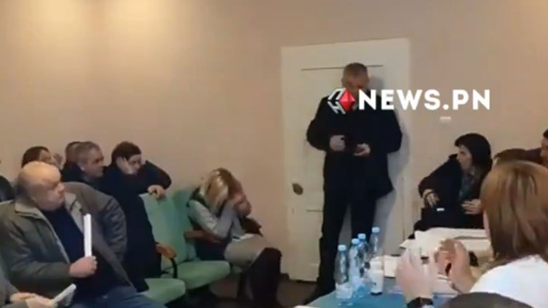 Σε βίντεο που κυκλοφόρησε στα μέσα κοινωνικής δικτύωσης, διακρίνεται ένας άνδρας να μπαίνει σε μια μικρή αίθουσα, όπου κάθονται ήδη πολλοί άνθρωποι. Επειτα από μια σύντομη συνομιλία, σε τεταμένο κλίμα όπως φαίνεται στα πλάνα, βγάζει από τις τσέπες του και πετά στο πάτωμα αντικείμενα που μοιάζουν με χειροβομβίδες.