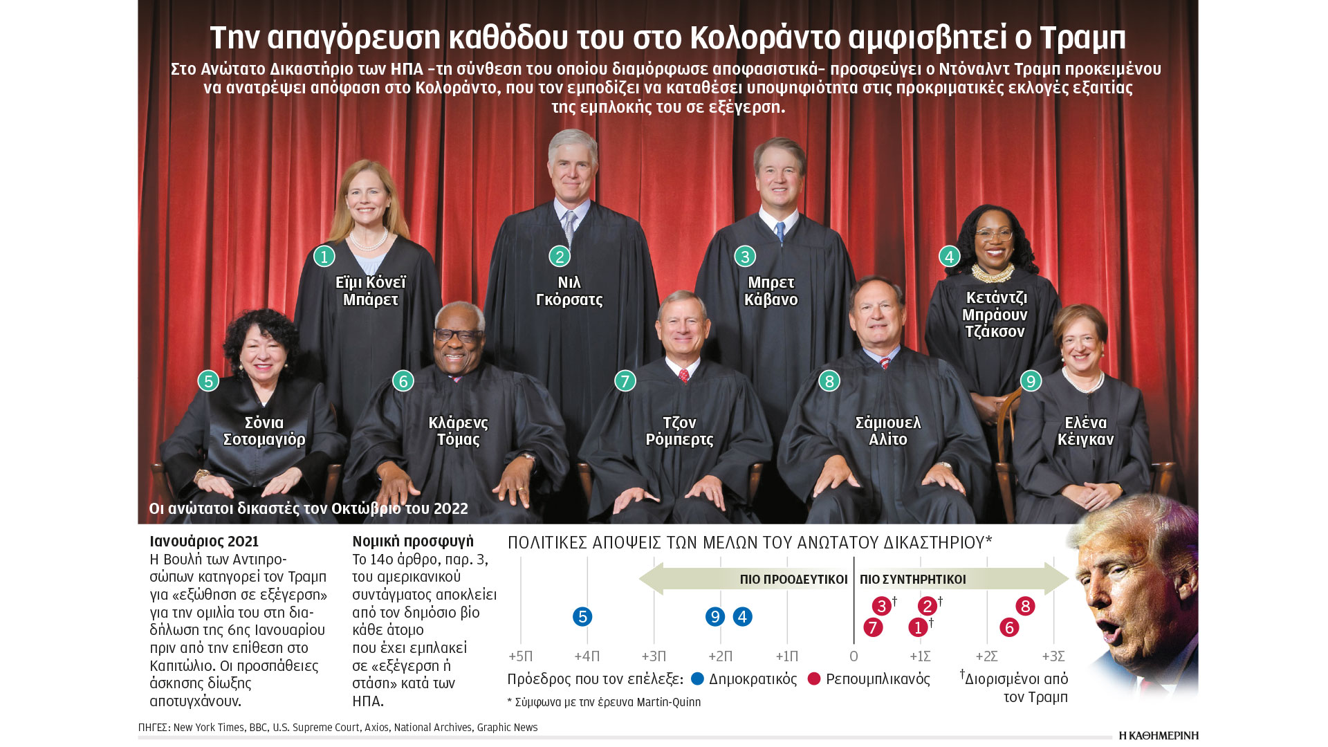 Τώρα, το Ανώτατο Δικαστήριο θα κληθεί να αποφασίσει πάνω σε ένα ακόμη θέμα, την απόφαση του Κολοράντο να τον αποκλείσει από τα ψηφοδέλτια των προκριματικών εκλογών. «Στην παρούσα θητεία του, το Ανώτατο Δικαστήριο πρόκειται να διαδραματίσει κρισιμότερο ρόλο από εκείνον που έπαιξε στην υπόθεση Μπους εναντίον Γκορ το 2000. Το θέμα δεν είναι μόνο εάν ο Τραμπ συμμετείχε σε εξέγερση, το οποίο θα τον απέκλειε από την προεδρία σύμφωνα με το 14ο άρθρο του συντάγματος, αλλά και ό,τι άπτεται της προεδρικής ασυλίας», λέει ο Ντέιβιντ Μπέκερ, επικεφαλής ερευνητικού ινστιτούτου στην Ουάσιγκτον.