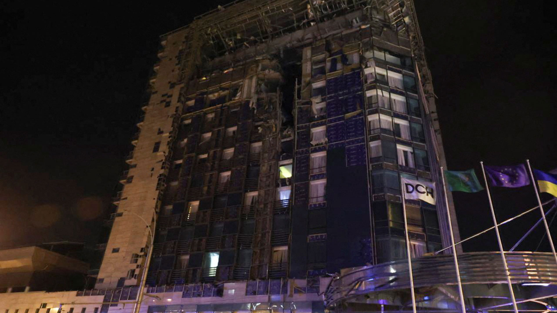 Τοπικά τηλεοπτικά δίκτυα μετέδωσαν εικόνες από το Kharkiv Palace Hotel στο κέντρο της πόλης που έχει υποστεί ζημίες.