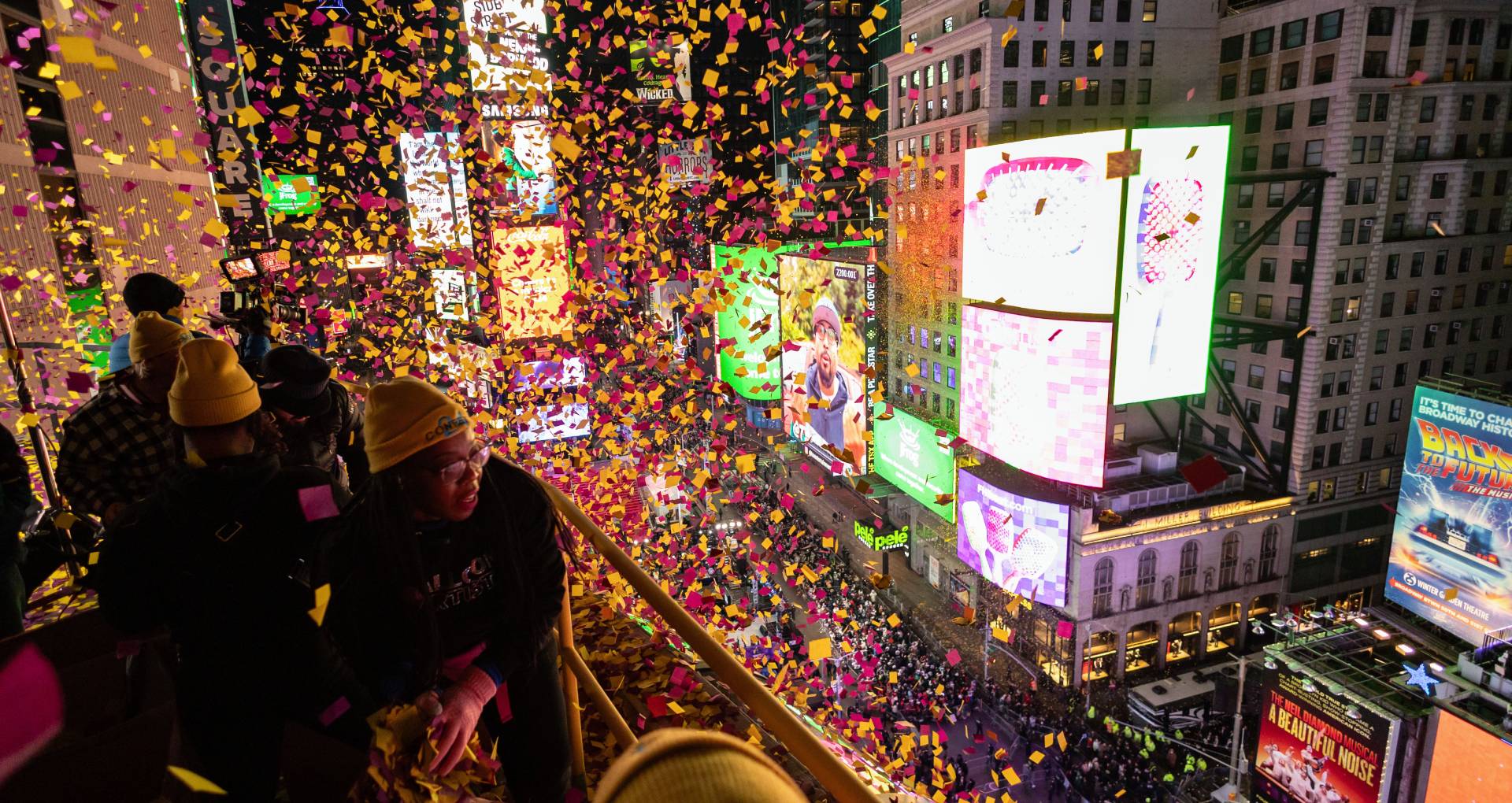 Στην Νέα Υόρκη, εκατομμύρια άνθρωποι περίμεναν την παραδοσιακή κάθοδο της κρυστάλλινης σφαίρας στην κατάφωτη Times Square.