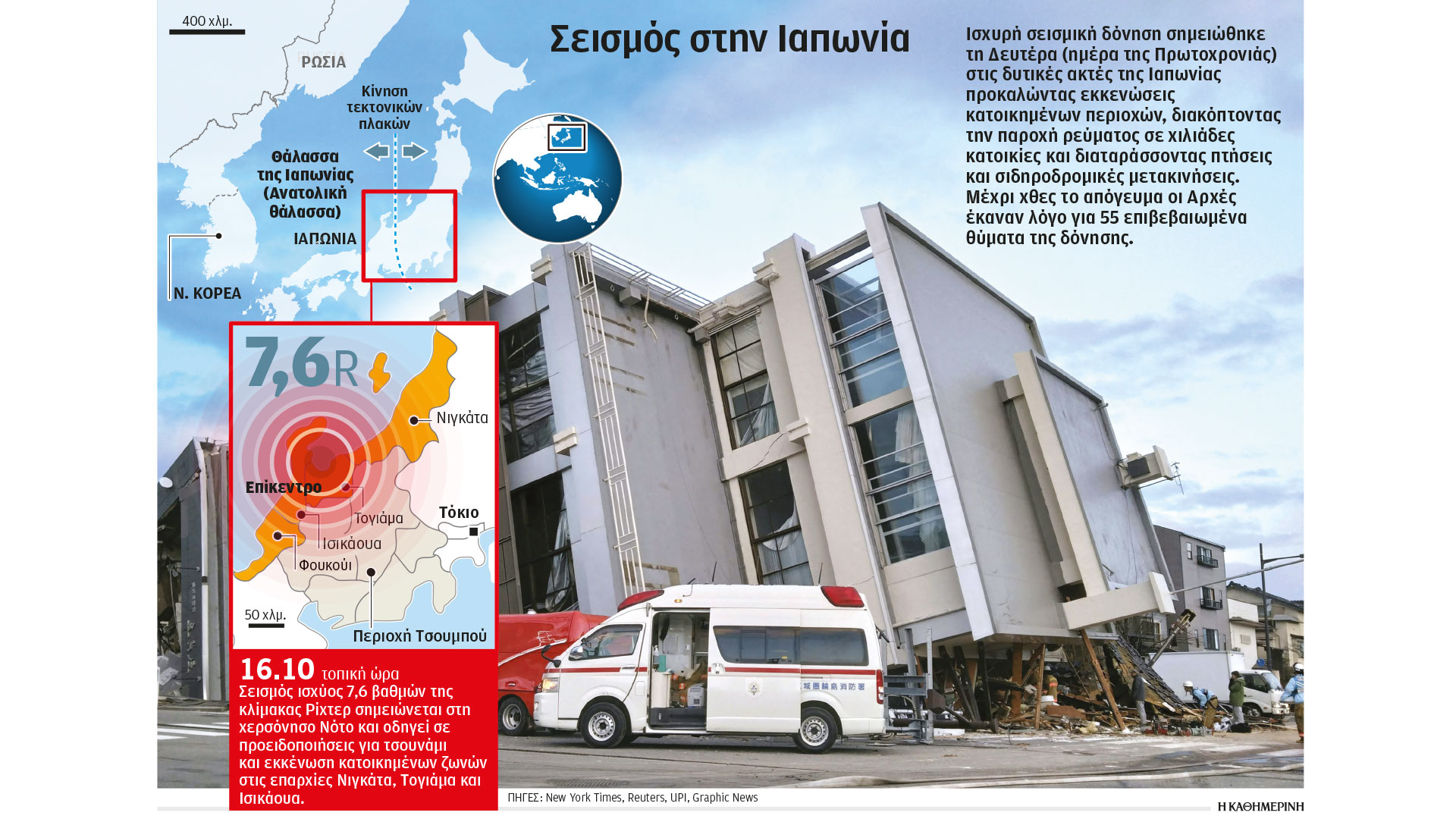 ΤΟΚΙΟ. Στην αποτελεσματικότητα των συστημάτων έγκαιρης προειδοποίησης πιστώνουν πολλοί ειδικοί τον σχετικά μικρό αριθμό θυμάτων από τον σεισμό των 7,6 Ρίχτερ που έπληξε τη δυτική Ιαπωνία την Πρωτοχρονιά. Τα μηνύματα σεισμικού συναγερμού που έλαβαν οι κάτοικοι των επαρχιών γύρω από το επίκεντρο επέτρεψαν την ταχεία εκκένωση πόλεων στα παράλια, παρότι τελικά η δόνηση δεν προκάλεσε τσουνάμι.