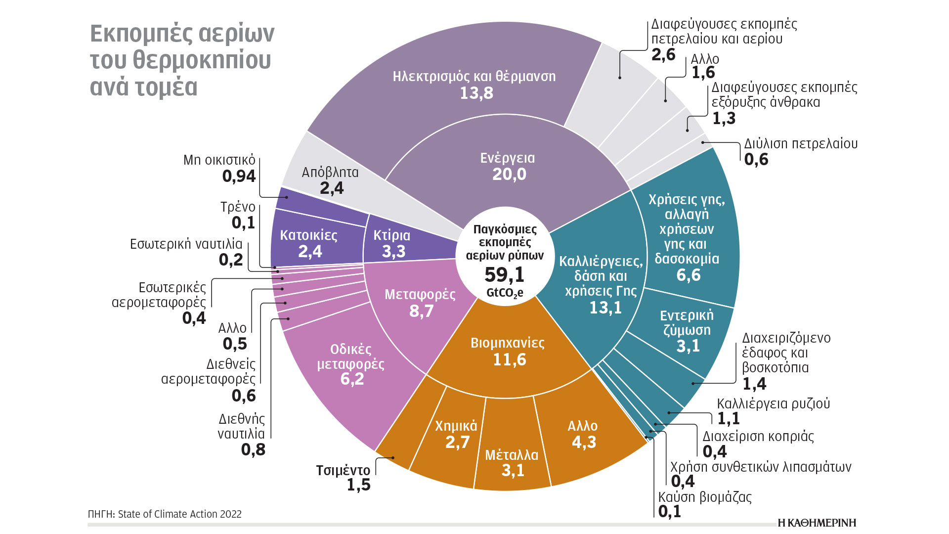 Στις εκπομπές ρύπων η ενέργεια θεωρείται η ρίζα του προβλήματος, με λιγότερη αναφορά σε γεωργία και βιομηχανία.