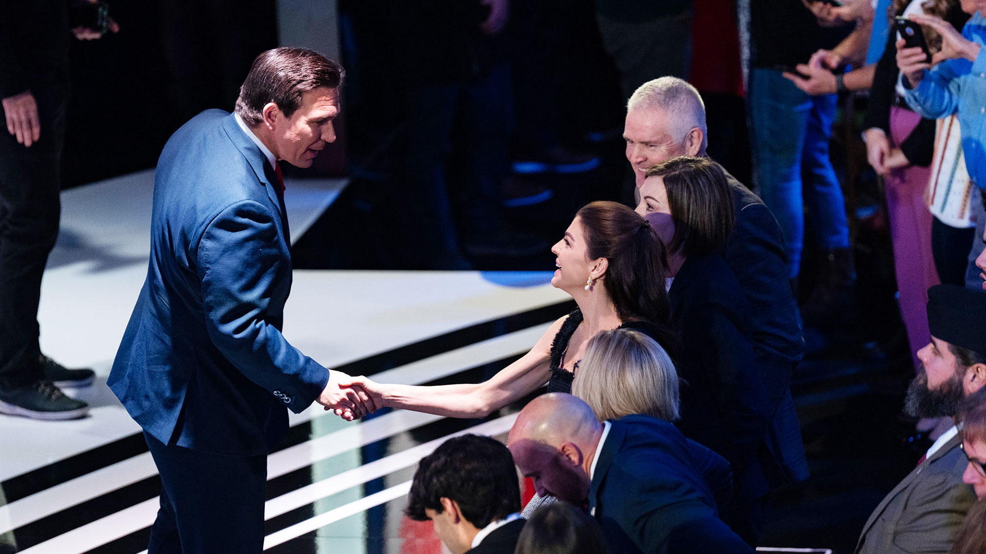 Κατά τη διάρκεια του δεύτερου διαλείμματος για διαφημίσεις στο ντιμπέιτ με την αντίπαλη υποψήφια για την προεδρία του Ρεπουμπλικανικού Κόμματος Νίκι Χέιλι, ο Ντε Σάντις πλησίασε στην άκρη του υπερυψωμένου πλατό και έκανε θερμή χειραψία με την κυβερνήτη της Αϊόβα, Κιμ Ρέινολντς. Αμέσως μετά, με την αυτοπεποίθηση ενός μπίζνεσμαν σε επιχειρηματικό ραντεβού προχώρησε σε θερμή χειραψία με τη σύζυγό του. «Είδαμε καλά;» αναρωτήθηκαν πολλοί και πολλές αυτόπτες.