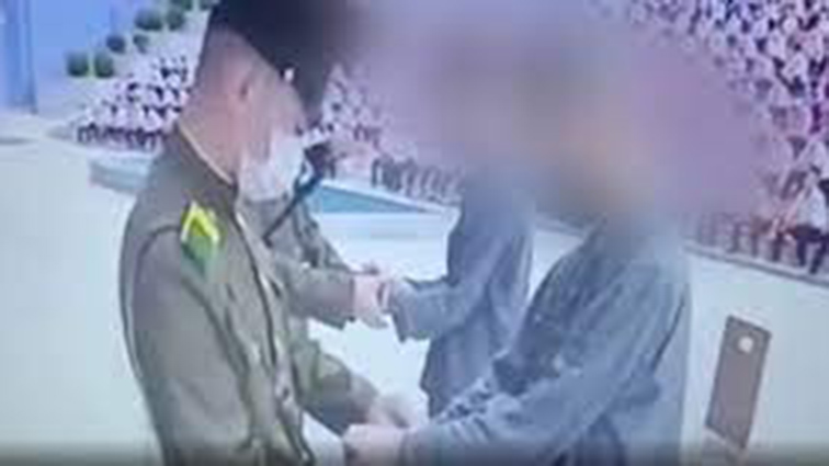 Στο βίντεο που δείχνει μια μεγάλη δημόσια δίκη, μπροστά σε ένα αμφιθέατρο με περίπου 1.000 μαθητές, οι δύο 16χρονοι φαίνονται να φορούν χειροπέδες. Όλοι οι μαθητές, συμπεριλαμβανομένων των δύο κατηγορουμένων, φορούν μάσκες, γεγονός που υποδηλώνει ότι το υλικό βιντεοσκοπήθηκε κατά τη διάρκεια της πανδημίας Covid.