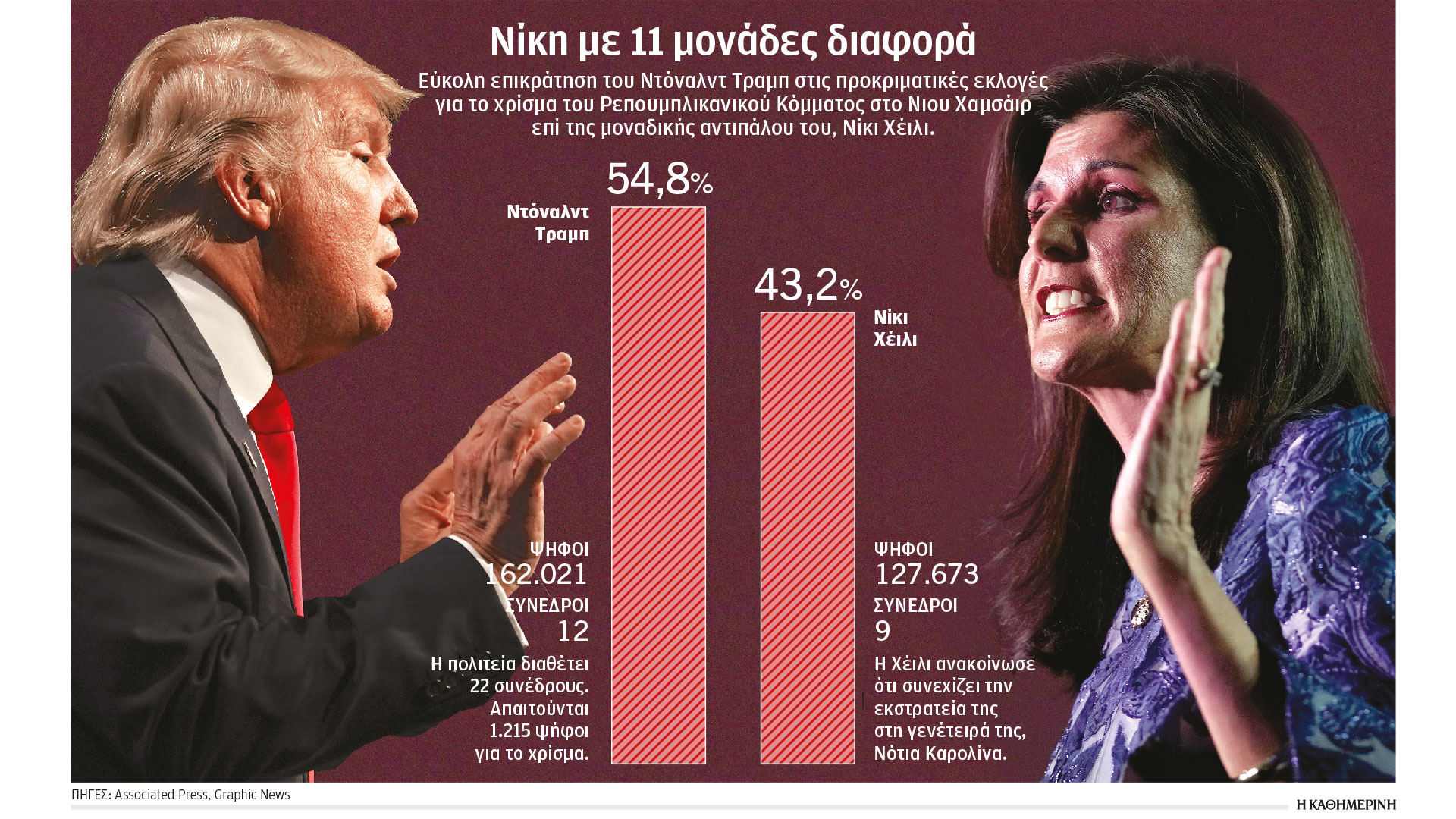 2. Δύσκολος δρόμος για τη Χέιλι. Η αναμέτρηση μεταφέρεται τώρα στη Νότια Καρολίνα, όπου η Χέιλι αντιμετωπίζει δύσκολη μάχη. Ο Τραμπ προηγείται στις δημοσκοπήσεις στη γενέτειρα της Χέιλι με 30 ποσοστιαίες μονάδες εδώ και μήνες. Μια ήττα της Χέιλι θα ήταν καταστροφική και θα την υποχρέωνε σε εγκατάλειψη. Εάν νικήσει αποφασιστικά στη Νότια Καρολίνα, ο Τραμπ θα μπορέσει να αποφύγει τη δαπανηρή εκστρατεία για τη Σούπερ Τρίτη 5 Μαρτίου, όταν 16 πολιτείες θα πραγματοποιήσουν τις προκριματικές αναμετρήσεις τους. Ο Τραμπ έδωσε ήδη πρόγευση της τακτικής που θα ακολουθήσει εναντίον της Χέιλι, κατηγορώντας την πρώην πρέσβειρα για διοχέτευση ρεπουμπλικανικών προεκλογικών κεφαλαίων στην εσωκομματική αναμέτρηση, αντί στην εκστρατεία κατά των Δημοκρατικών και του Μπάιντεν.