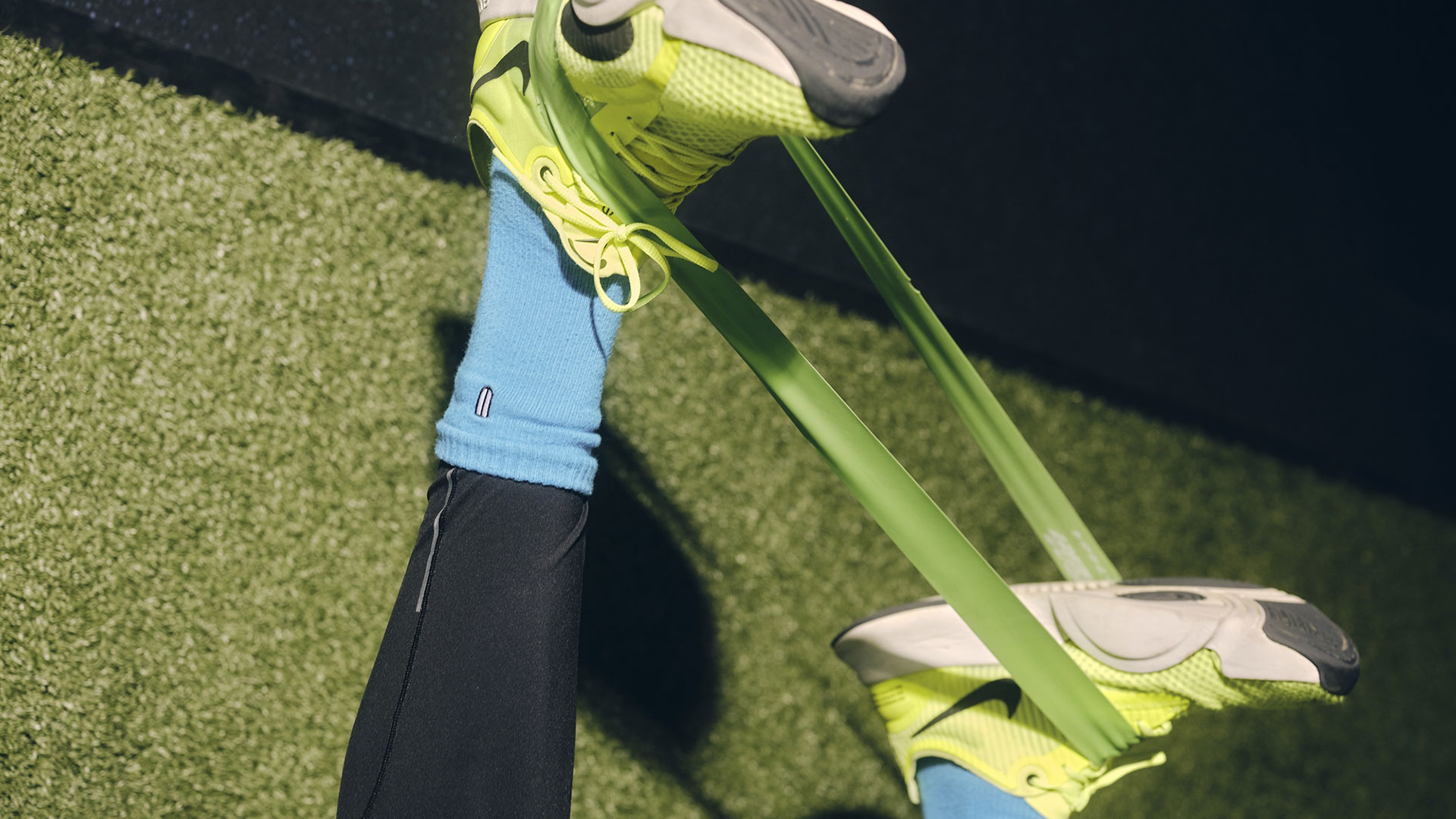 Ο Μπράιαντ βάζει ένα γύρω από τους αστραγάλους ή τα γόνατά του, στη συνέχεια ακουμπάει τα χέρια του στο πάτωμα με ένα λάστιχο γύρω από τους καρπούς και περπατάει πλάγια, τεντώνοντας τα λάστιχα καθώς μετακινείται.