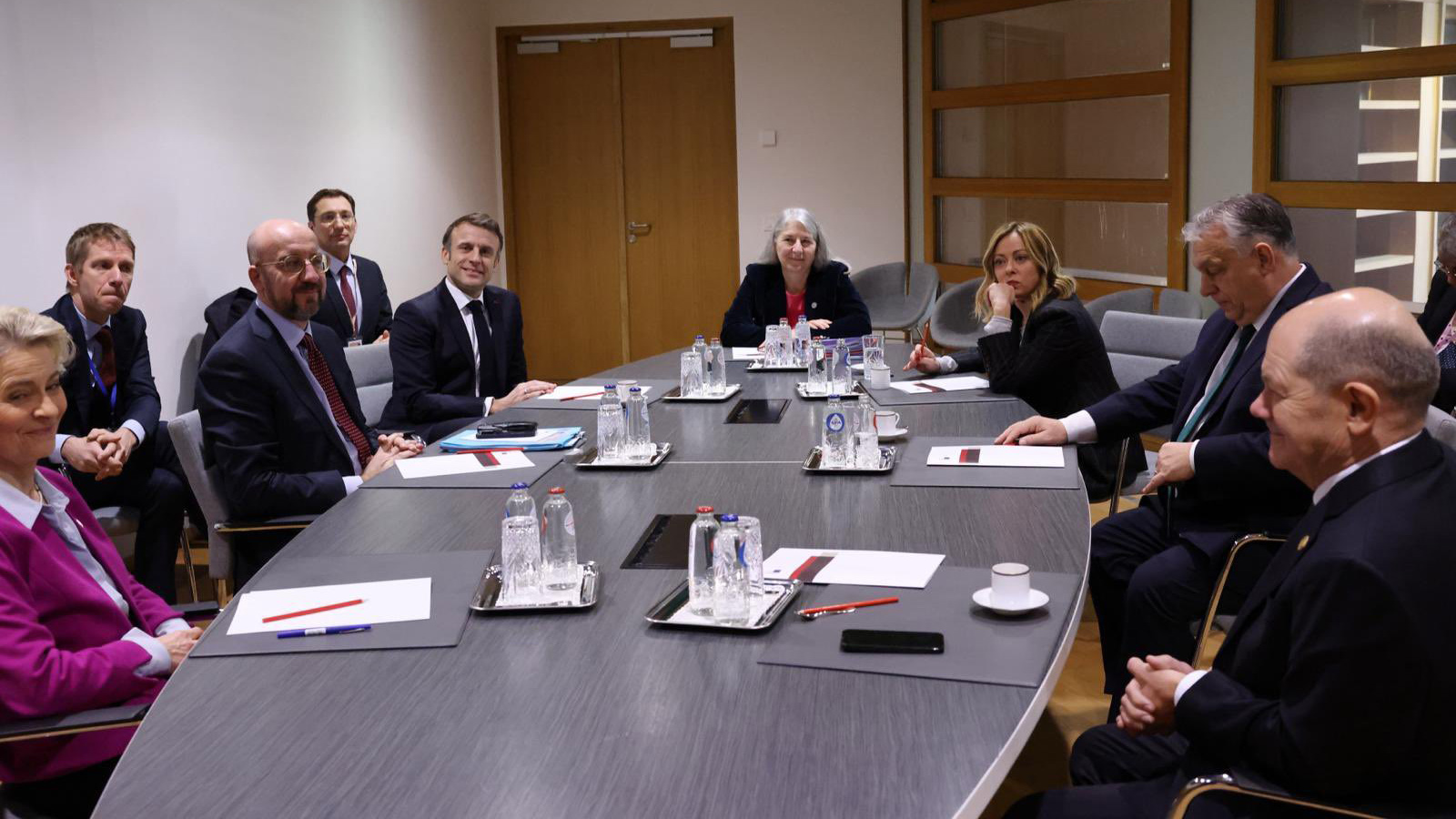 Για τον λόγο αυτόν, ο πρόεδρος του Ευρωπαϊκού Συμβουλίου Σαρλ Μισέλ διοργάνωσε λίγο πριν από την έναρξη της Συνόδου Κορυφής συνάντηση με τον Ούγγρο πρωθυπουργό Βίκτορ Ορμπαν και με τη συμμετοχή της προέδρου της Κομισιόν Ούρσουλα φον ντερ Λάιεν, του Γάλλου προέδρου Εμανουέλ Μακρόν, του Γερμανού καγκελάριου Ολαφ Σολτς και της Ιταλίδας πρωθυπουργού Τζόρτζια Μελόνι.