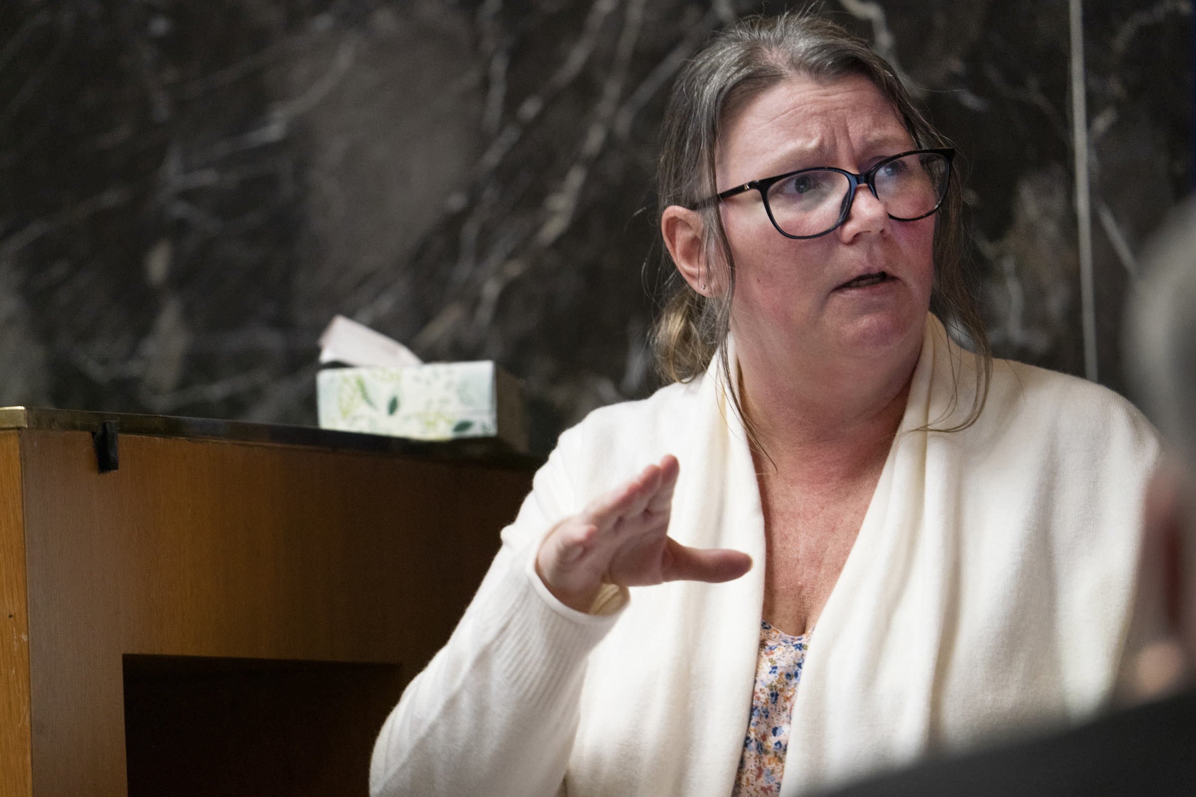 Η Κράμπλεϊ εμφανίστηκε ασυγκίνητη και κοίταξε προς τα κάτω καθώς διαβαζόταν η ετυμηγορία από το δικαστήριο της κομητείας Οκλαντ την Τρίτη.