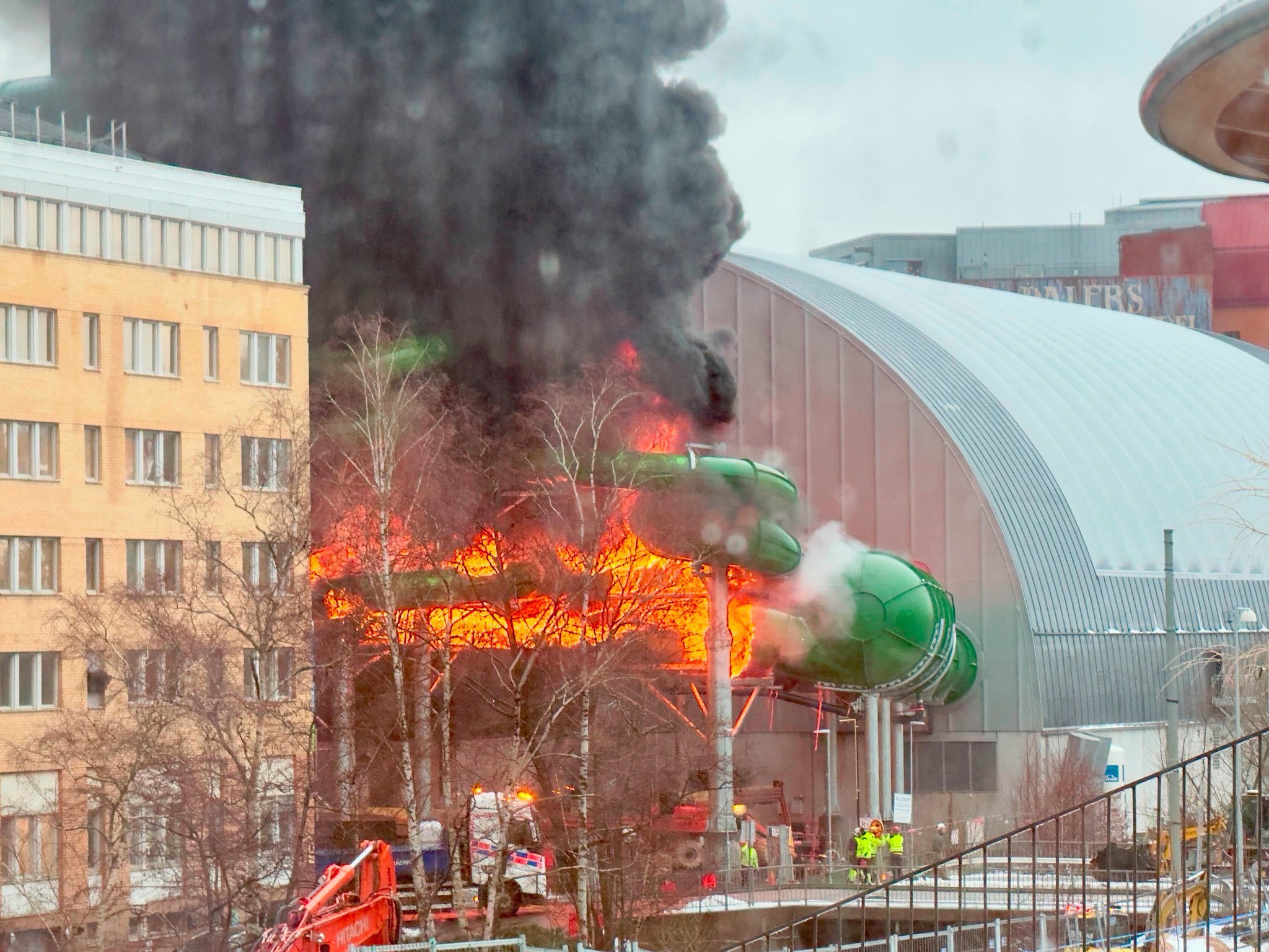 Σε πλάνα από βίντεο που έχουν αναρτηθεί στα κοινωνικά δίκτυα, φαίνονται οι νεροτσουλήθρες να έχουν τυλιχτεί στις φλόγες, ενώ πολλά πυροσβεστικά οχήματα έσπευσαν στην περιοχή.
