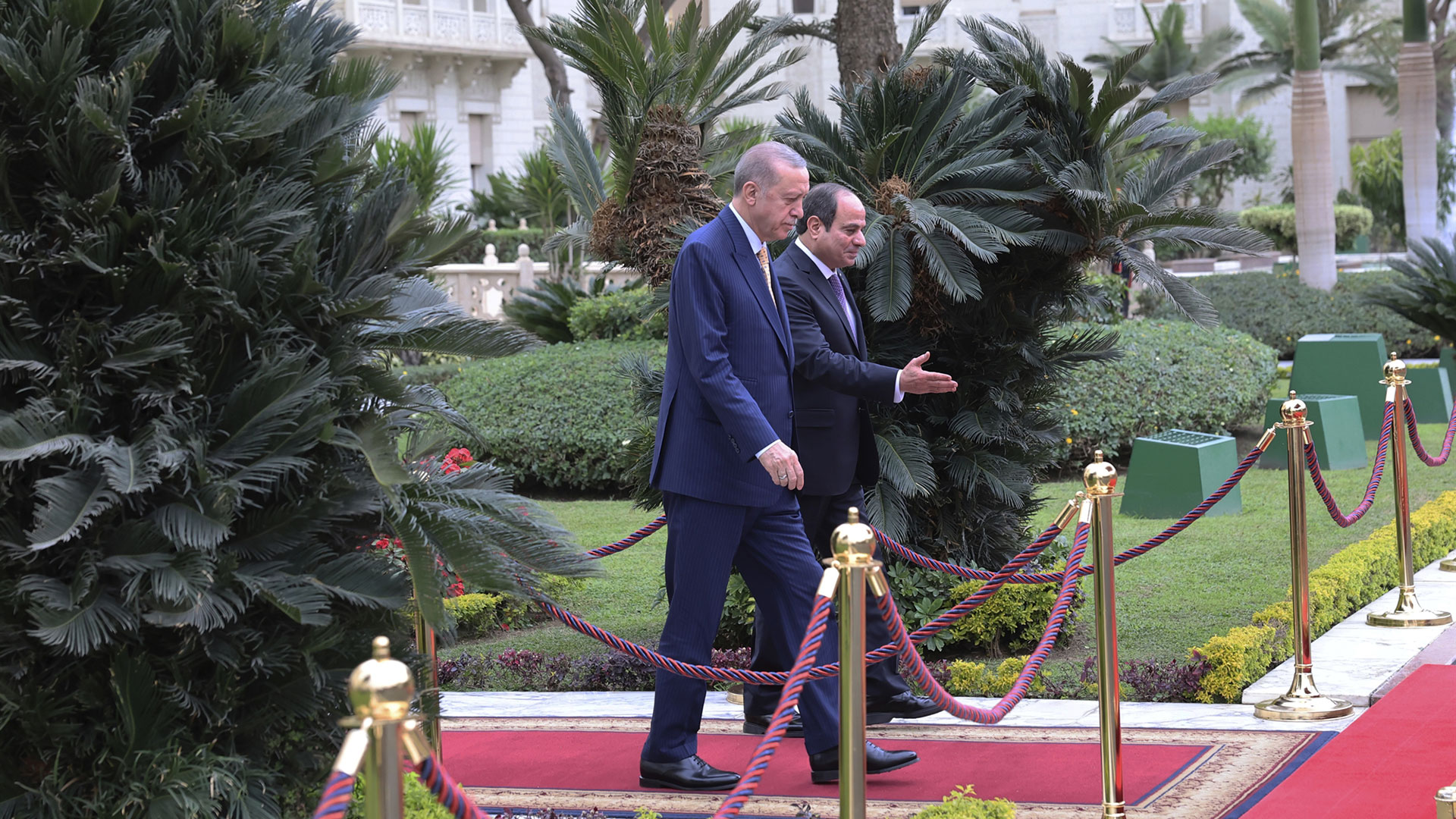 Πρόκειται για την πρώτη επίσκεψη Τούρκου προέδρου στην Αίγυπτο έπειτα από 12 χρόνια, με τον Ταγίπ Ερντογάν να εμφανίζεται αποφασισμένος να γυρίσει μια «νέα σελίδα» στις σχέσεις του με τον Αιγύπτιο πρόεδρο, τον οποίο κάποτε αποκαλούσε «πραξικοπηματία» και «δολοφόνο». Η αποφασιστικότητα του προέδρου για την αποκατάσταση των σχέσεων με το Κάιρο φάνηκε από τη μεγάλη αποστολή, καθώς τον συνόδευαν ο υπουργός Εξωτερικών Χακάν Φιντάν, ο υπουργός Οικονομικών Μεχμέτ Σιμσέκ, ο υπουργός Αμυνας Γιασάρ Γκιουλέρ, ο υπουργός Υγείας Φαχρετίν Κοτζά, ο υπουργός Βιομηχανίας και Τεχνολογίας Μεχμέτ Φατίχ Κατζίρ, ο υπουργός Εμπορίου Ομέρ Μπολάτ, ο διευθυντής επικοινωνίας της Τουρκίας Φαχρετίν Αλτούν αλλά και ο διοικητής των τουρκικών μυστικών υπηρεσιών Ιμπραήμ Καλίν.