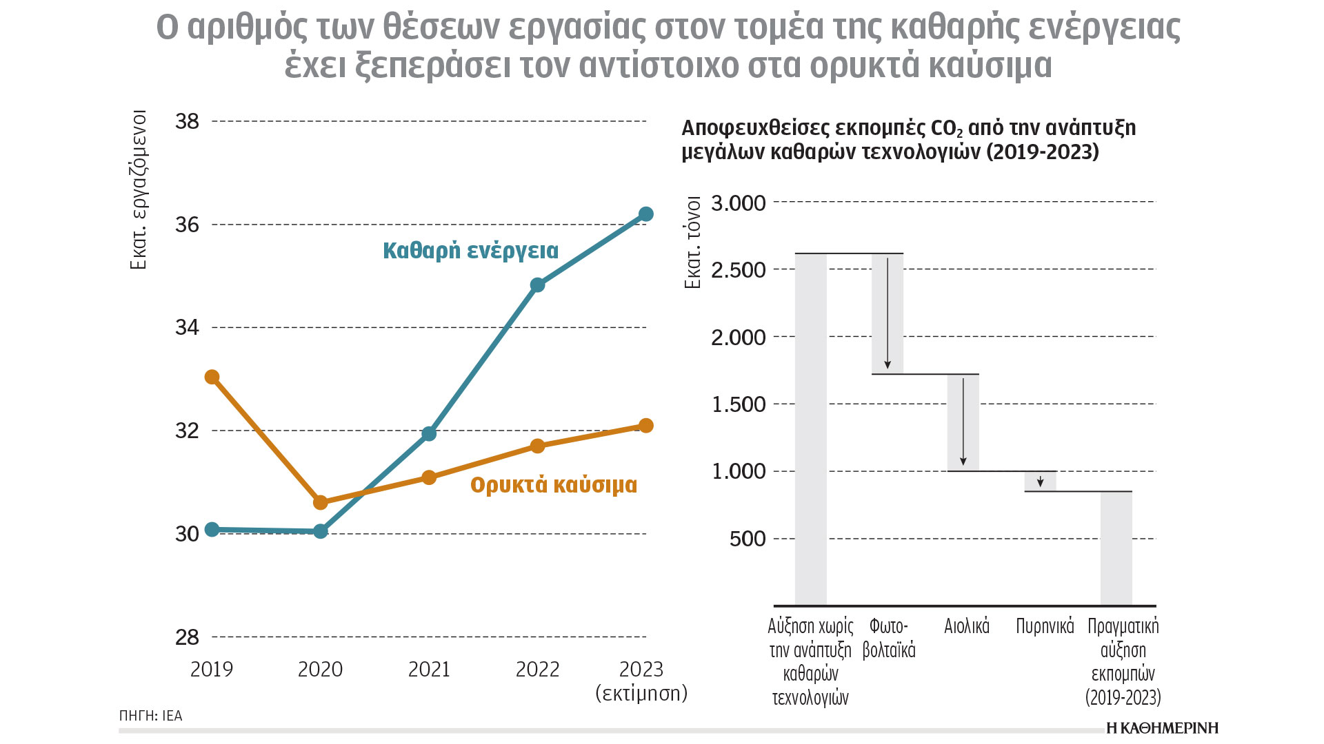 Στις αναπτυσσόμενες οικονομίες τα 2/3 των ενεργειακών θέσεων εργασίας, στις ανεπτυγμένες οικονομίες το 1/3. Η τελική πραγματική αύξηση το διάστημα 2019-2023 των εκπομπών κατά μόνο 1,1%, αντί για τον τριπλάσιο όγκο που κανονικά θα υπήρχε, οφείλεται στη σημαντική ανάπτυξη σε παγκόσμιο επίπεδο των ανανεώσιμων πηγών ενέργειας (κυρίως φωτοβολταϊκών και αιολικών).