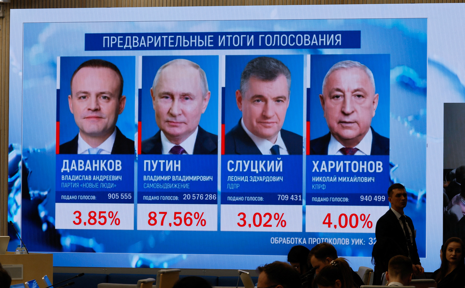 Υπενθυμίζεται ότι σύμφωνα με τα πρώτα επίσημα στοιχεία, ο 71χρονος Βλαντιμίρ Πούτιν φέρεται να εξασφαλίζει μια νέα εξαετή θητεία στην προεδρία της Ρωσίας με ποσοστό 87,97%.