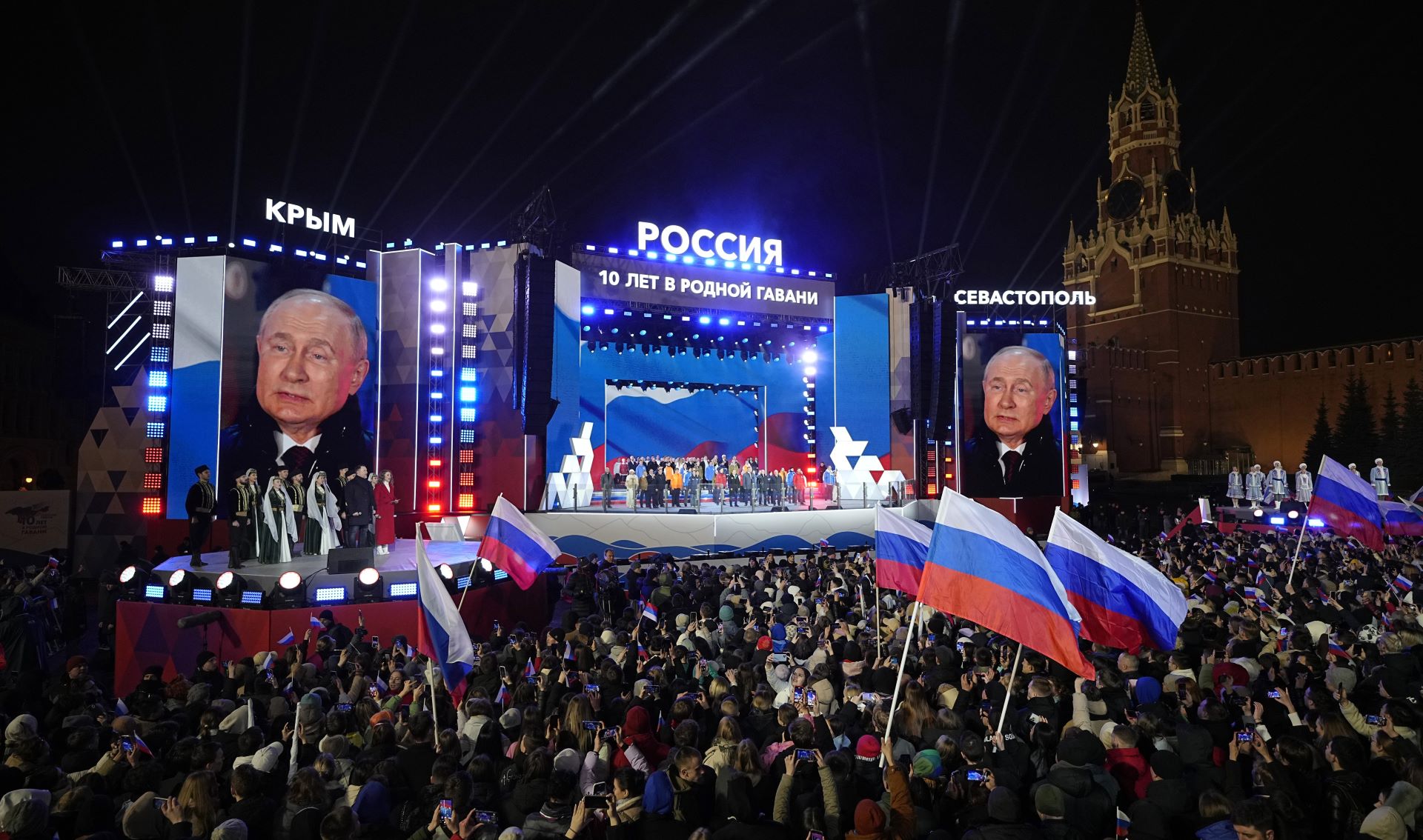 Ο Βλαντίμιρ Πούτιν απευθύνθηκε στο πλήθος που είχε συγκεντρωθεί στην Κόκκινη Πλατεία της Μόσχας για να παρακολουθήσει πατριωτική συναυλία εορτασμού της 10ης επετείου της προσάρτησης της Κριμαίας.
