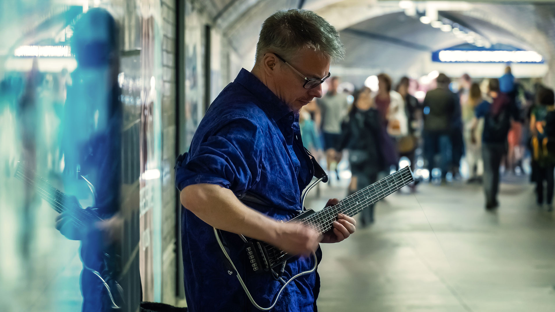 Λίγο πριν τις 10 το πρωί οι συρμοί δεν είναι ασφυκτικά γεμάτοι. Στα νότια του Τάμεση, δίπλα στην κυλιόμενη σκάλα που οδηγεί στον σταθμό του Southwark, ο 30χρονος Νικ Γουντς τραγουδάει Τζόνι Κας.