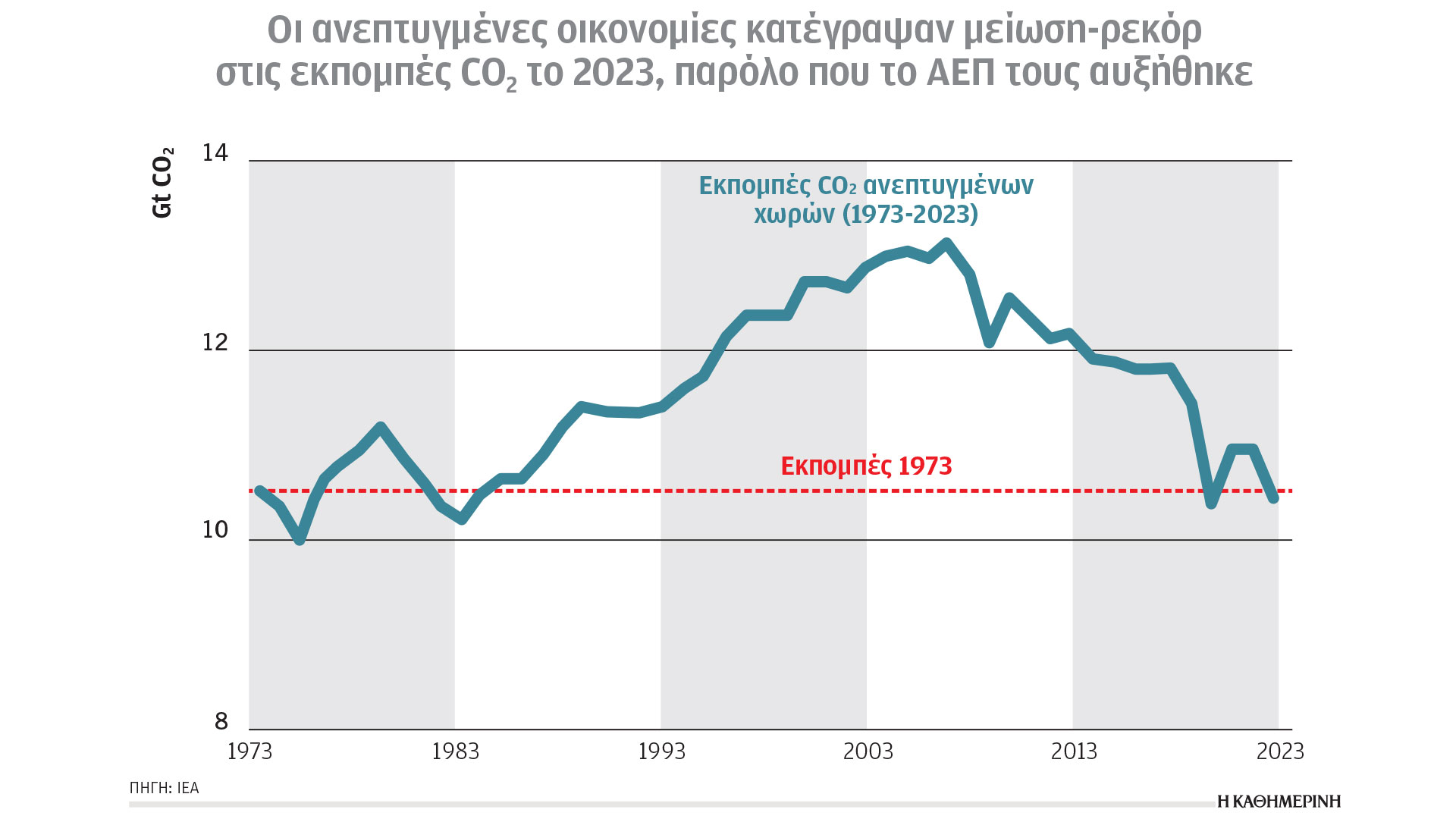 Με βάση στοιχεία του Διεθνούς Οργανισμού Ενέργειας (ΙΕΑ), η αύξηση της καθαρής ενέργειας περιόρισε την αύξηση των παγκόσμιων εκπομπών το 2023. Οι ανεπτυγμένες οικονομίες (κυρίως οι Ηνωμένες Πολιτείες, η Ευρωπαϊκή Ενωση και η Ιαπωνία) σημείωσαν μείωση-ρεκόρ το 2023, παρόλο που το Ακαθάριστο Εγχώριο Προϊόν τους αυξήθηκε. Οι εκπομπές τους έχουν υποχωρήσει στα επίπεδα του 1973, αποδεικνύοντας πως η πράσινη μετάβαση μπορεί να συμπορεύεται με την οικονομική ανάπτυξη και την ευημερία κοινωνιών και χωρών.