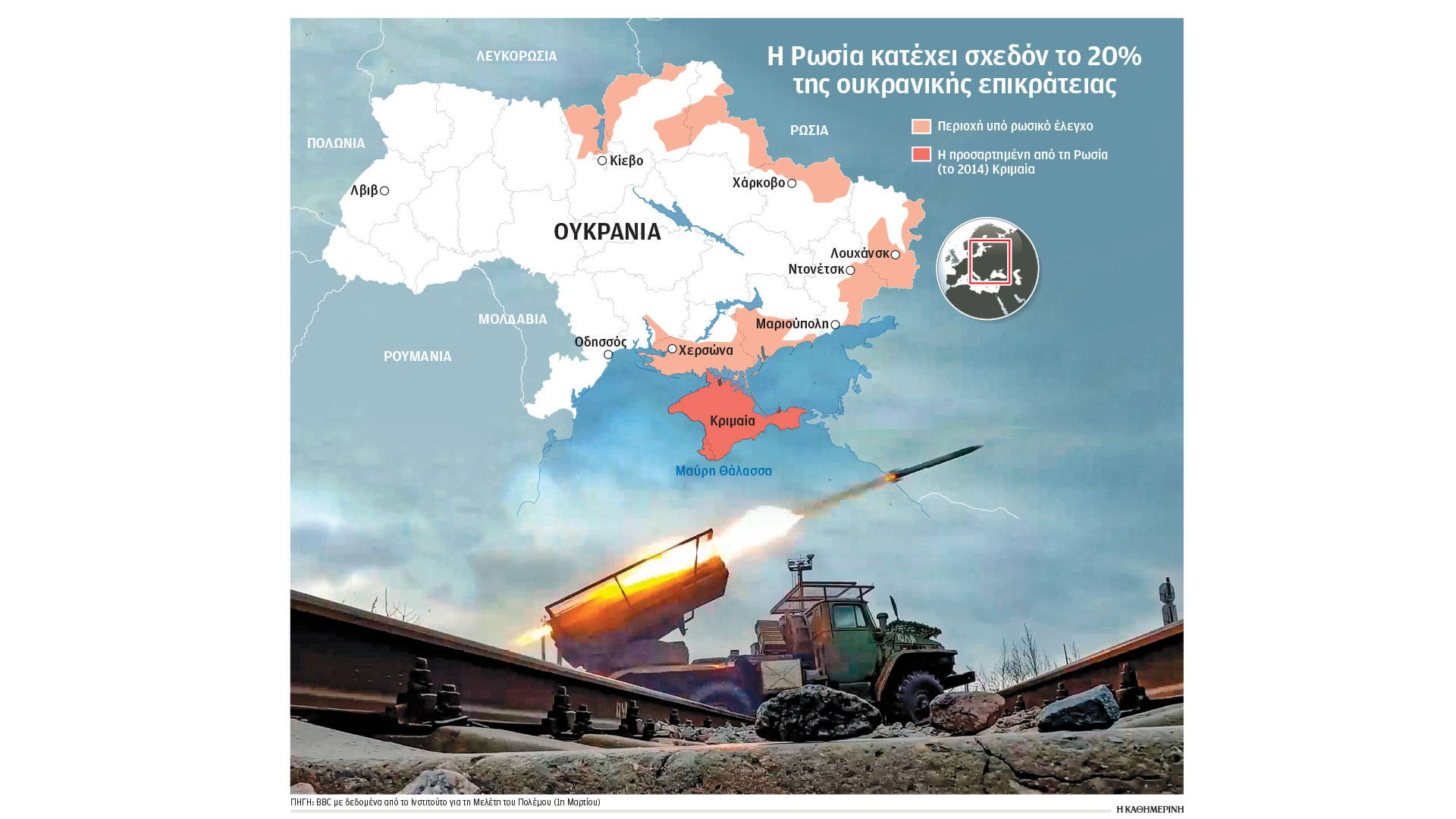 Αν «πέσει» η ουκρανική άμυνα, η Ρωσία πιθανότατα θα επιστρέψει στον αρχικό στόχο της, που ήταν η εισβολή στο Κίεβο και η ανατροπή της ουκρανικής κυβέρνησης. Στην πραγματικότητα η Ουκρανία θα πρέπει να εγκαταλείψει τα όπλα της και να μετασχηματίσει τον στρατό της σε μια μορφή εγχώριας αστυνομικής δύναμης. Αυτομάτως οι προσαρτημένες περιοχές που βρίσκονται υπό ρωσικό έλεγχο θα καταστούν οριστικά και αμετάκλητα τμήματα της ρωσικής επικράτειας. Ορισμένοι αναλυτές θεωρούν μάλιστα ότι η Μόσχα δεν θα αρκεστεί στην αλλαγή της διακυβέρνησης, αλλά θα κατακτήσει ολόκληρη την ουκρανική επικράτεια μετουσιώνοντας σε πράξη το ρωσικό αφήγημα που αμφισβητεί το δικαίωμα ύπαρξης της Ουκρανίας ως ανεξάρτητης εθνικής οντότητας και οραματίζεται την αναβίωση των συνόρων της Σοβιετικής Ενωσης.