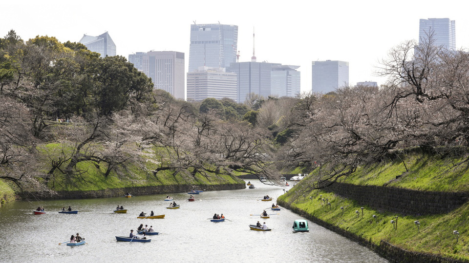 Πολλοί λάτρεις των λουλουδιών είχαν δώσει ραντεβού στο κέντρο της ιαπωνικής πρωτεύουσας για να θαυμάσουν τις ολάνθιστες κερασιές και τα ροζ και λευκά πέταλα των λουλουδιών τους να αιωρούνται πάνω από τις τάφρους που περιβάλλουν το Αυτοκρατορικό Παλάτι.