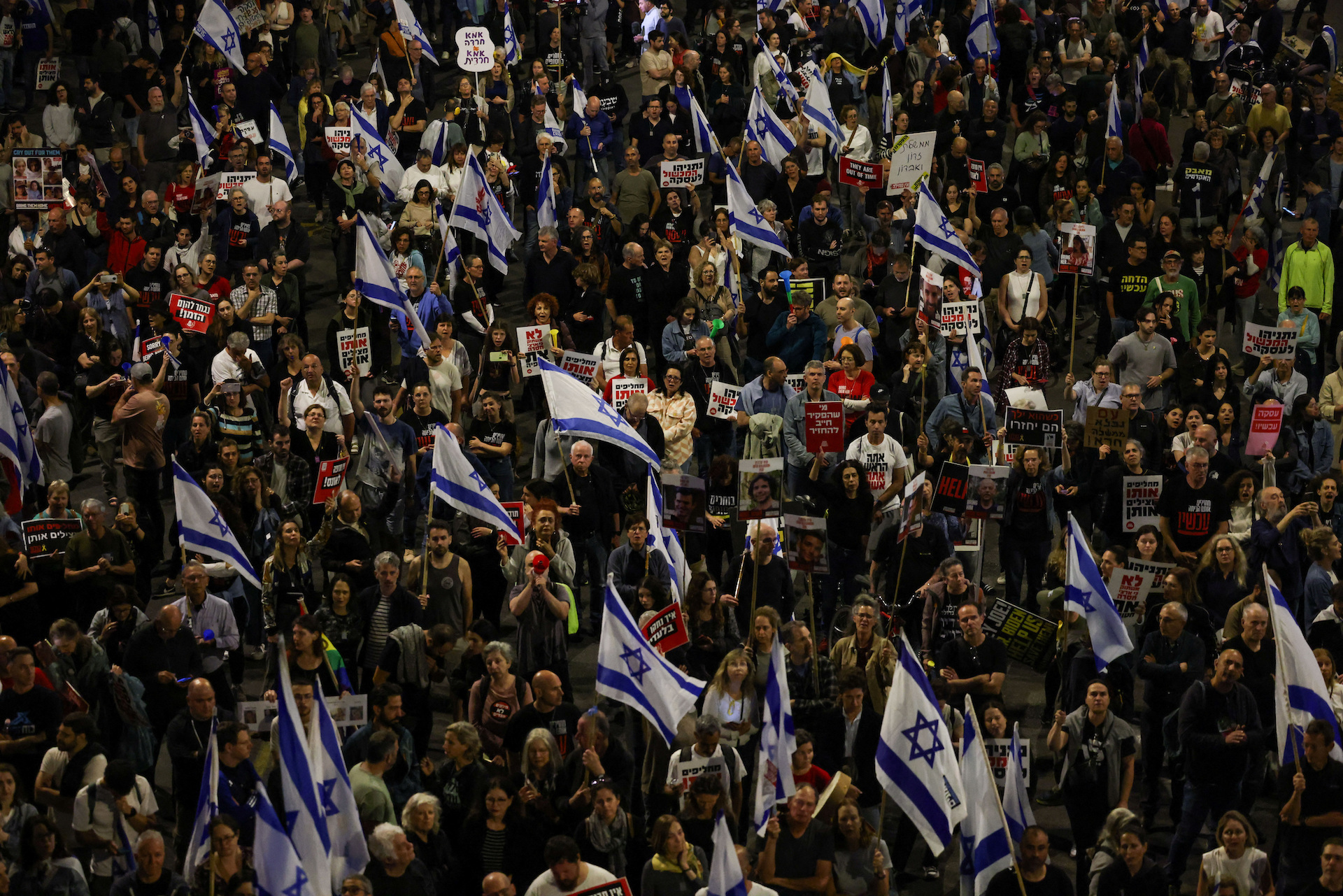 Στο Τελ-Αβίβ, περίπου 100.000 άνθρωποι, σύμφωνα με τους οργανωτές, συγκεντρώθηκαν στην «πλατεία της δημοκρατίας», μια διασταύρωση που ονομάσθηκε έτσι έπειτα από τις συγκεντρώσεις του 2023 εναντίον της δικαστικής μεταρρύθμισης.