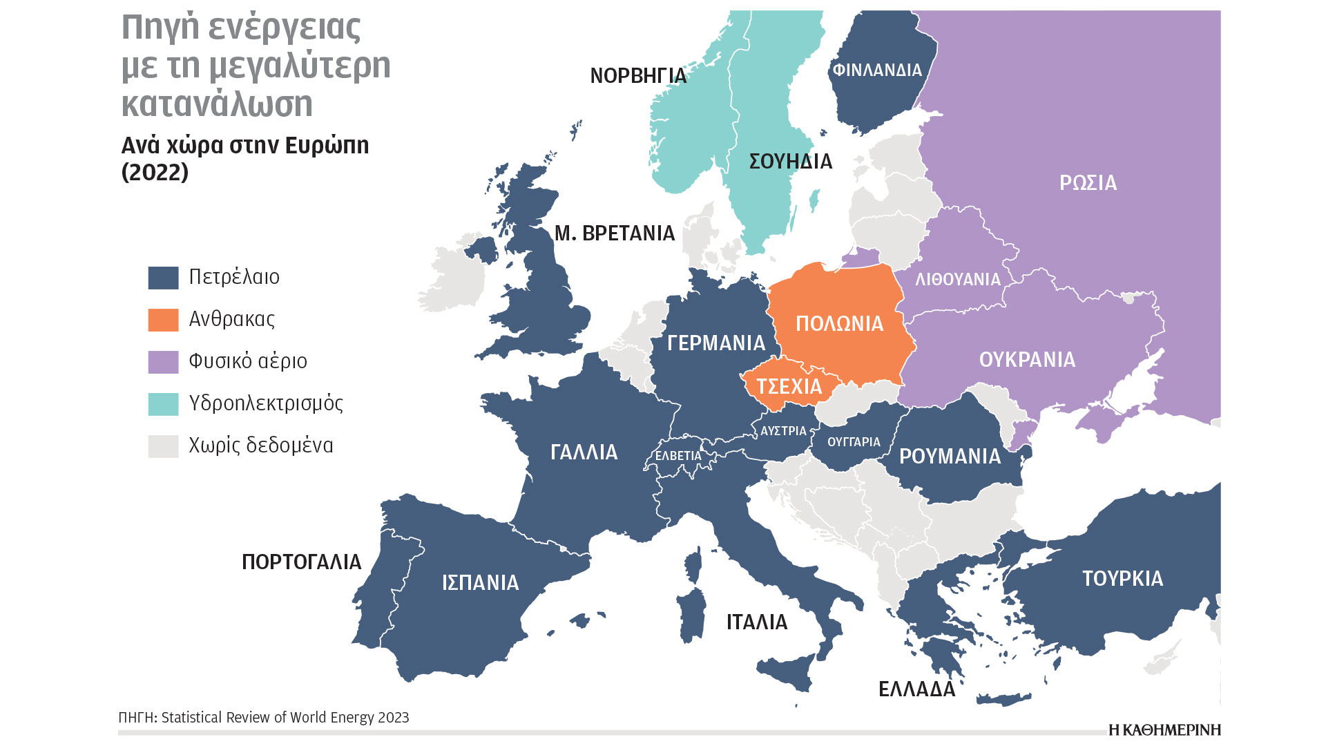 Ενώ η Ευρώπη έχει θέσει ως στόχο την απομάκρυνση από τα ορυκτά καύσιμα, ακόμη τα χρησιμοποιεί ως βασική πηγή ενέργειας. Η Σουηδία και η Νορβηγία αποτελούν εξαιρέσεις, λόγω χρήσης υδροηλεκτρικής ενέργειας (από τα πολλά ποτάμια τους), ενώ η Φινλανδία έχει ισοδύναμο ισοζύγιο κατανάλωσης πετρελαίου και ανανεώσιμων. Μετά την εισβολή της Ρωσίας στην Ουκρανία και τη διακοπή τροφοδοσίας με ρωσικό φυσικό αέριο, η Ευρώπη αύξησε σημαντικά τη χρήση πετρελαίου στην παραγωγή ενέργειας. Διαφοροποίηση υπήρξε και στη Γαλλία με τα πολλά πυρηνικά, λόγω των αναγκών για συντήρηση και επισκευή των αντιδραστήρων της.