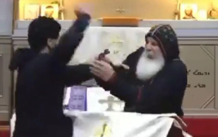 Βίντεο που διακινήθηκε στα μέσα κοινωνικής δικτύωσης καταγράφει την άγρια επίθεση στον ιερωμένο, αλλά και την αντίδραση των εκκλησιαζομένων που ουρλιάζοντας σπεύδουν να ακινητοποιήσουν τον δράστη και να βοηθήσουν τον ιερέα.