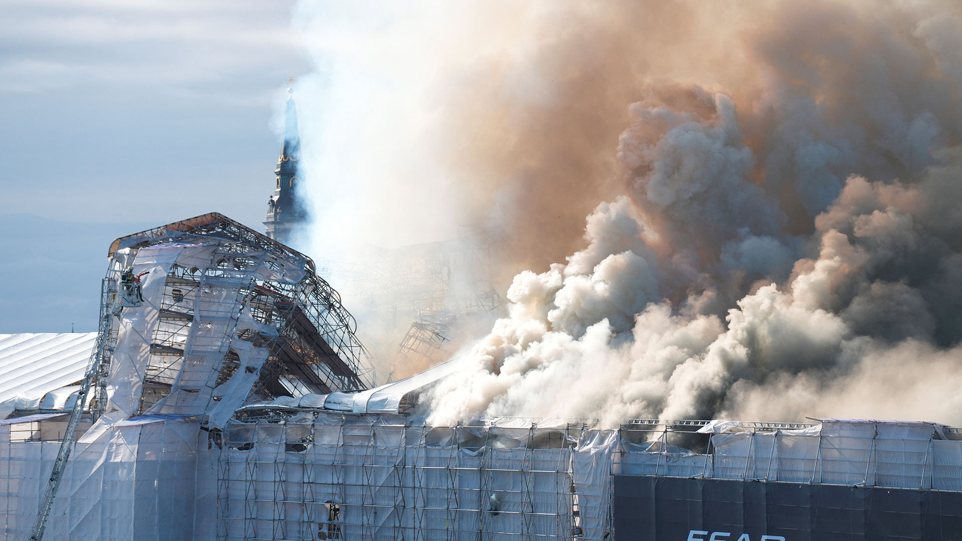 The historical Børsen Stock Exchange building in Copenhagen is on fire.