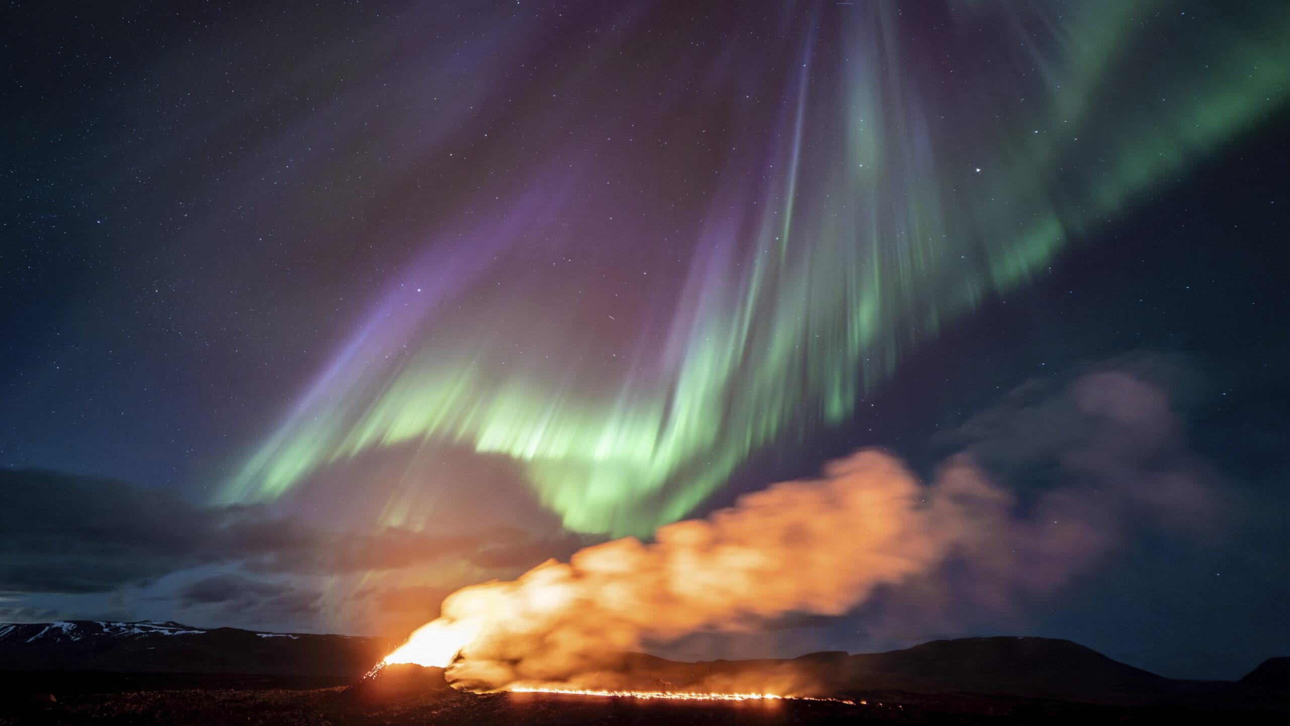Αυτή τη φορά, «φιλοδώρησε» τον τηλεοπτικό φακό με ένα διπλό καθηλωτικό θέαμα που χώρεσε στο ίδιο κάδρομ την έκρηξη του ηφαιστείου κοντά στο Γκρίνταβικ, που συνεχίζει να εκτοξεύει λάβα εδώ και 28 ημέρες, και μία «έκρηξη» ουράνιων χρωμάτων του Βόρειου Σέλαος.