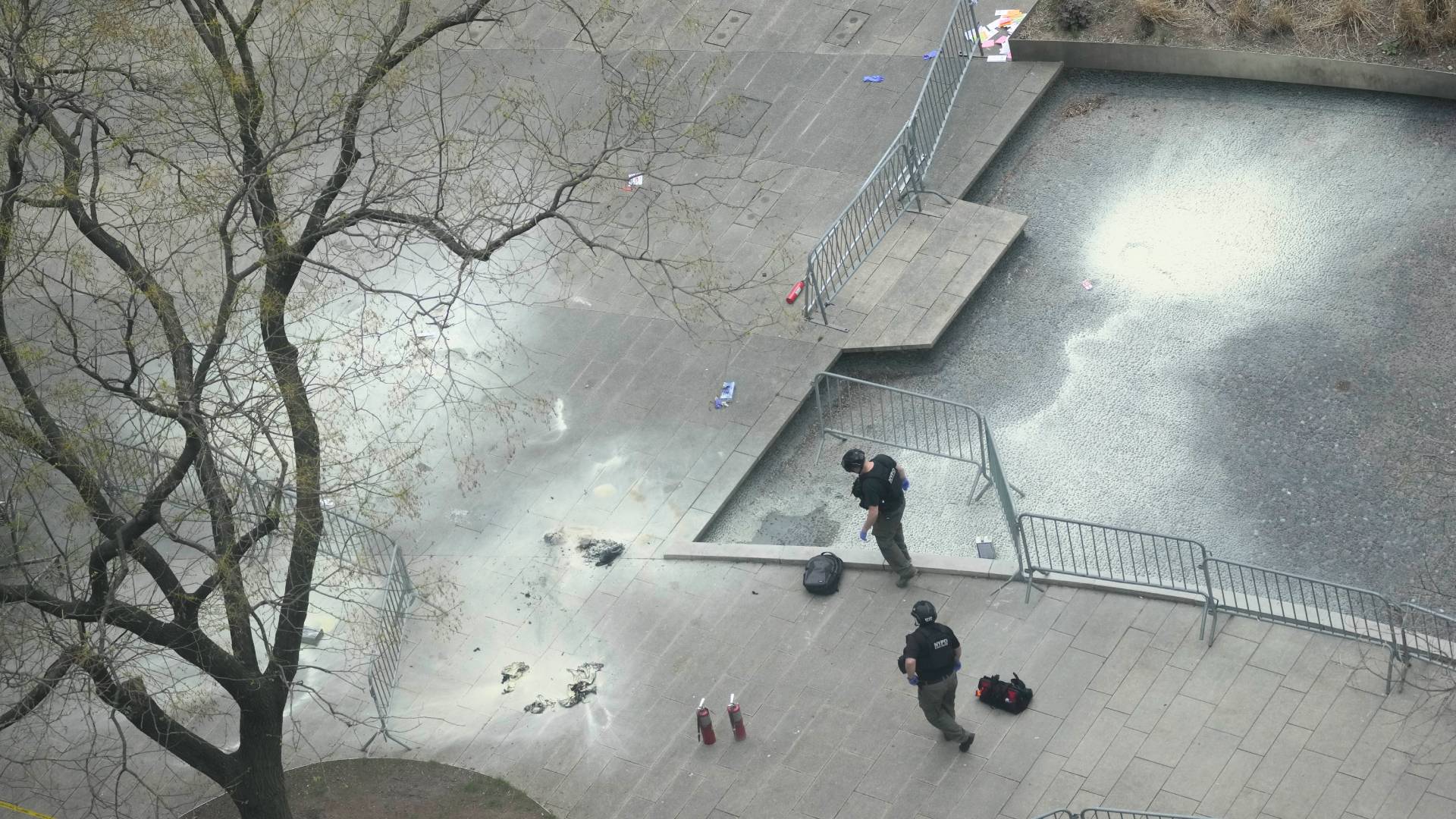 Η μυρωδιά του καπνού ήταν αισθητή στο σημείο λίγο μετά το περιστατικό, σύμφωνα με αυτόπτη μάρτυρα του Reuters, ενώ αστυνομικός ψέκαζε με πυροσβεστήρα το έδαφος. Εκείνη την ώρα στο σημείο υπήρχε ένα σακίδιο που σιγόκαιγε και ένα γκαζάκι.