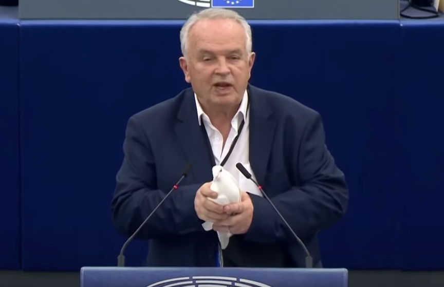Ο Σλοβάκος ευρωβουλευτής, Μίροσλαβ Ραντακόβσκι καθώς μιλούσε από το βήμα του Ευρωκοινοβουλίου έβγαλε ένα ζωντανό περιστέρι από την τσάντα του και το απελευθέρωσε στο χώρο, ευχόμενος παγκόσμια ειρήνη.