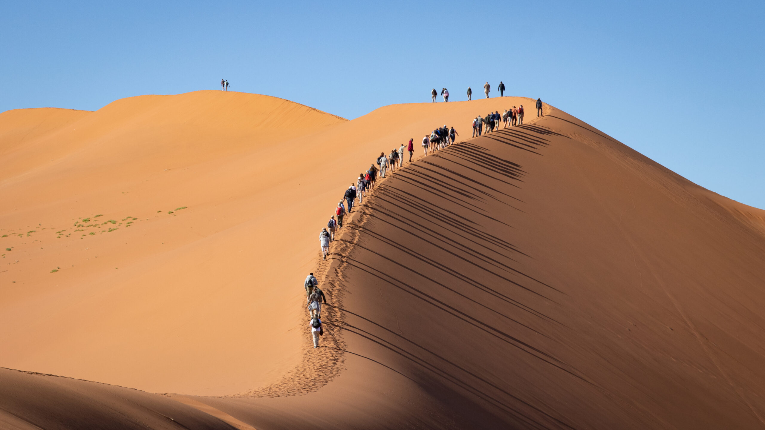 Further inland, the oxidised sands are fiery orange. Big Daddy, the largest dune in Sossusvlei, rises 325m above a clay pan, Deadvlei, where blackened camelthorn trees are all that remains from a river that once ran here.