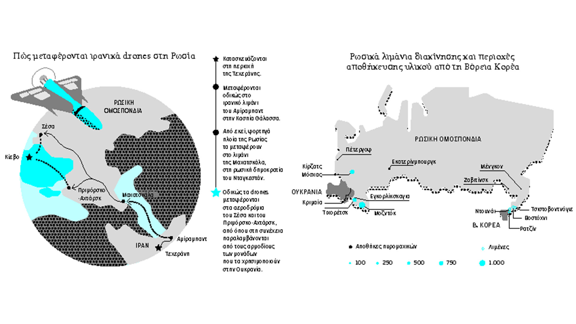 Επιπλέον, η Βόρεια Κορέα έστειλε στη Ρωσία 4.035 κοντέινερ με στρατιωτικό εξοπλισμό, που εκτιμάται ότι αφορά κυρίως βαλλιστικούς πυραύλους και βλήματα. Τα συστήματα που στέλνει η Βόρεια Κορέα φτάνουν σε ρωσικά λιμάνια στην Απω Ανατολή και από εκεί ακολουθούν μια τεράστια σιδηροδρομική διαδρομή προτού εναποτεθούν σε αποθήκες που βρίσκονται κοντά στην Ουκρανία, στα σύνορα με τη Λευκορωσία, αλλά και στα περίχωρα της Μόσχας.