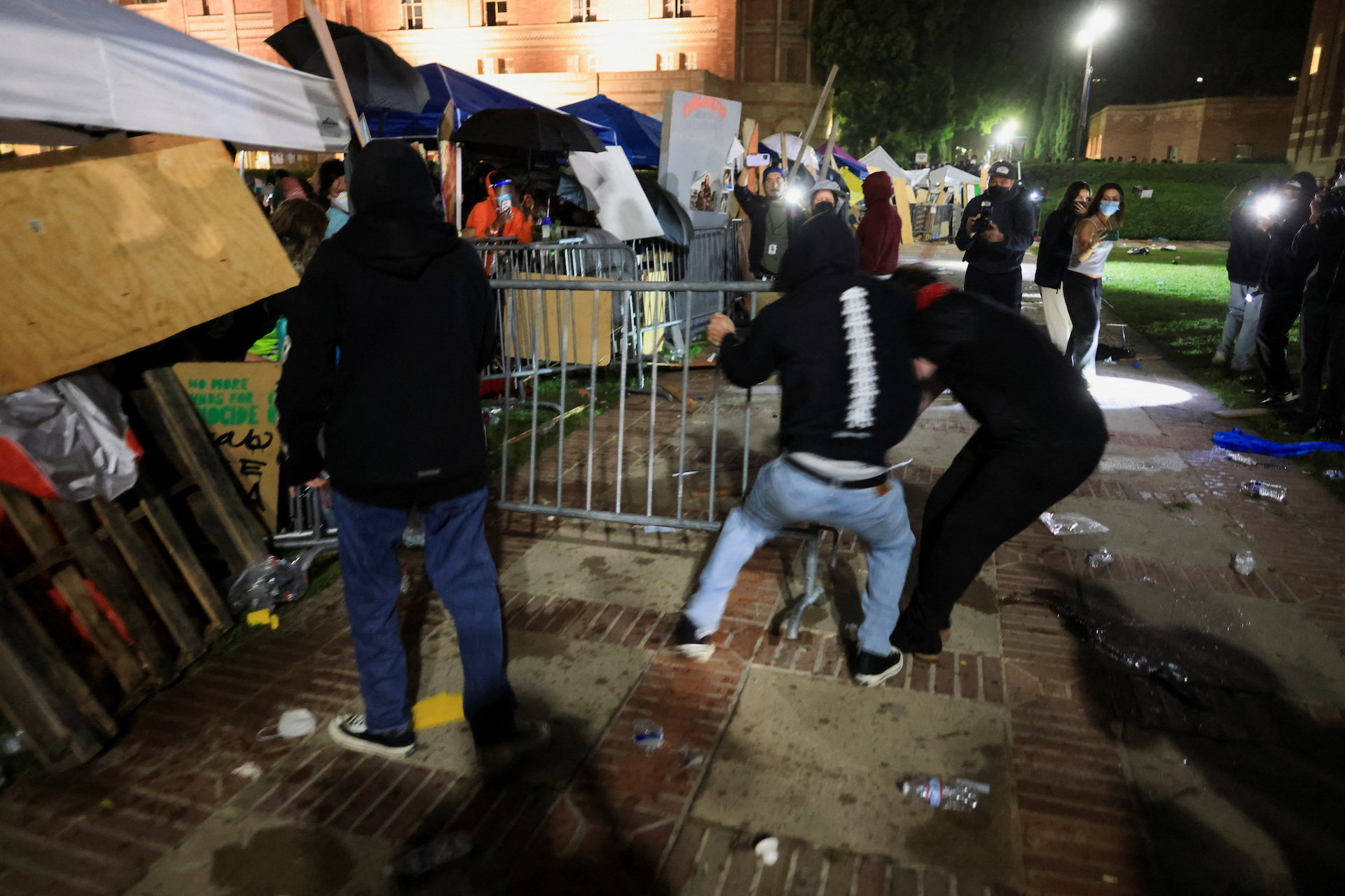 Συγκρούσεις σημειώθηκαν τα ξημερώματα της Τετάρτης όχι μόνο στον χώρο του Πανεπιστημίου Κολούμπια στη Νέα Υόρκη η κατάληψη του οποίου εκκενώθηκε έπειτα από επέμβαση της αστυνομίας, αλλά και στον χώρο του Πανεπιστημίου της Καλιφόρνιας στο Λος Αντζελες (UCLA), όταν αντίπαλες ομάδες διαδηλωτών συνεπλάκησαν γύρω από την κατασκήνωση που είχε στηθεί σε αλληλεγγύη προς την Παλαιστίνη.