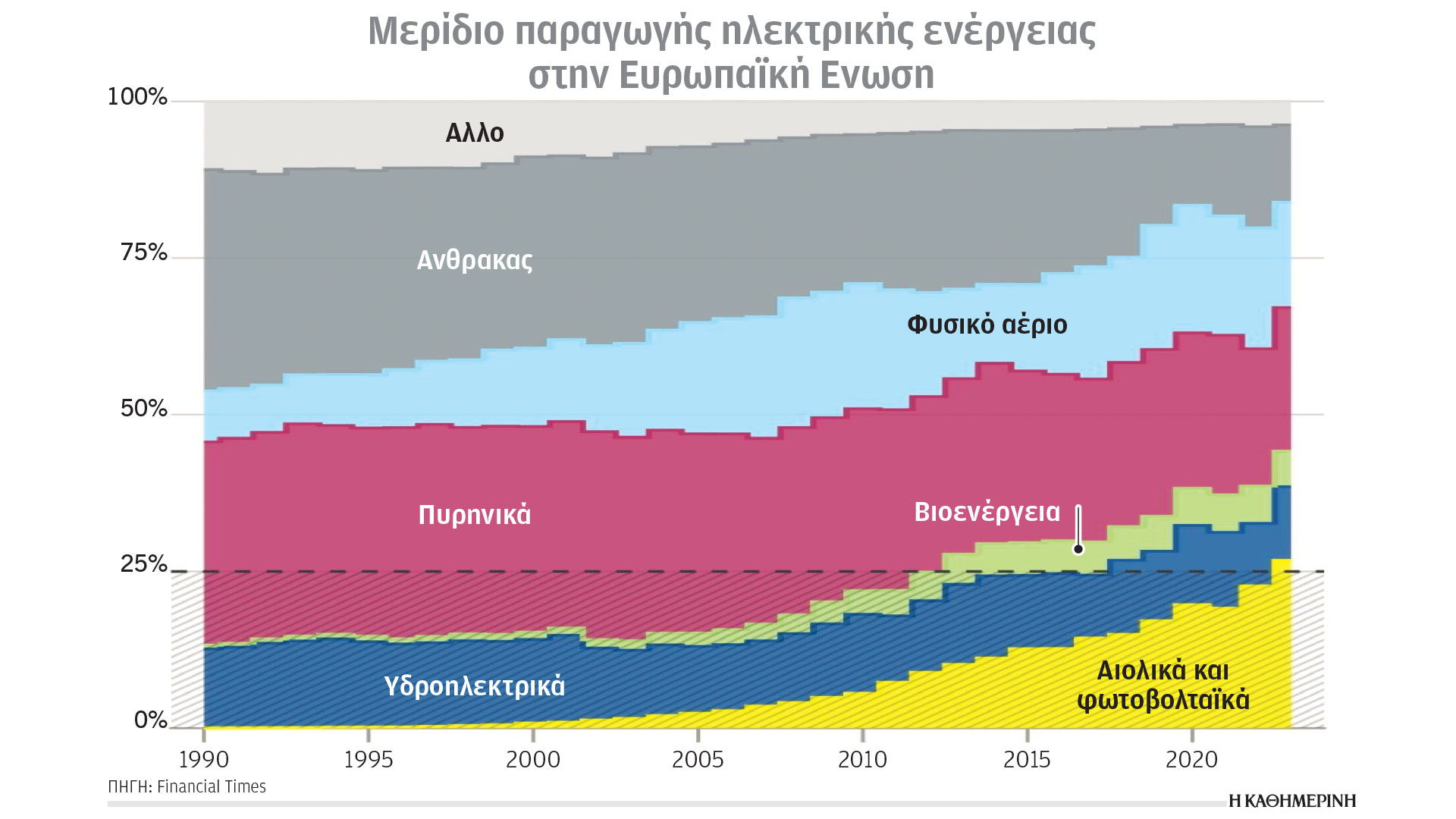 Στην Ευρώπη, συνεχίζονται τα ρεκόρ, αφού πλέον πάνω από το 25% της συνολικά παραγόμενης ηλεκτρικής ενέργειας προέρχεται από το άθροισμα αιολικών και φωτοβολταϊκών, περιορίζοντας τη χρήση άνθρακα στο 12% (με μεγαλύτερους παραγωγούς τη Γερμανία και την Πολωνία), ισοφαρίζοντας το ποσοστό των υδροηλεκτρικών, αλλά και ξεπερνώντας τη χρήση φυσικού αερίου (17%). Εξίσου σημαντική πηγή ενέργειας για την Ευρώπη είναι τα πυρηνικά, που αποτελούν το 23%, τα οποία μαζί με τα αιολικά και τα φωτοβολταϊκά αθροίζουν σχεδόν το 50% της συνολικά παραγόμενης ηλεκτρικής ενέργειας της Ευρώπης.