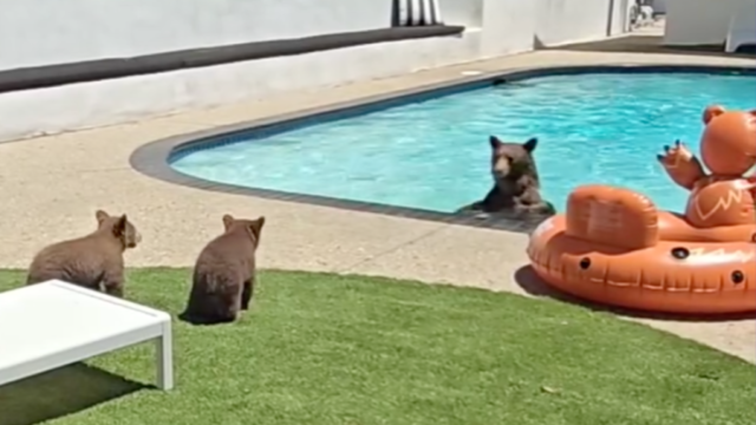 Μια μαμά αρκούδα με τα δύο μικρά της φαίνεται πως βρήκαν δροσερό καταφύγιο στην πισίνα μιας οικογένειας στη Μονρόβια – περίπου μισή ώρα απόσταση από το Λος Αντζελες.