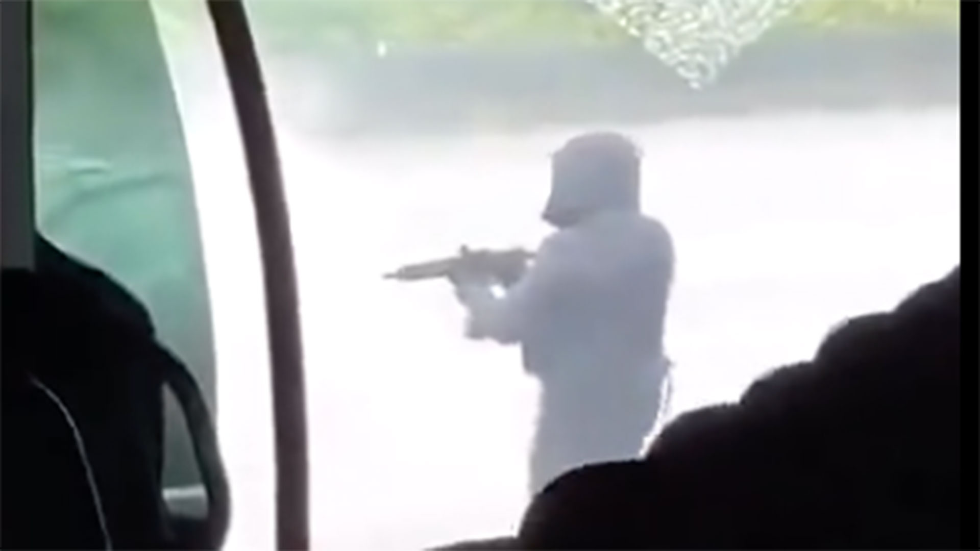 Eικόνες που κυκλοφόρησαν στα μέσα κοινωνικής δικτύωσης απεικονίζουν τουλάχιστον δύο άνδρες με καλυμμένα τα χαρακτηριστικά τους να κρατούν όπλα κοντά σε ένα φλεγόμενο SUV. Το SUV φαίνεται πως εμβόλισε το όχημα των φυλακών, στην μπροστινή του πλευρά.