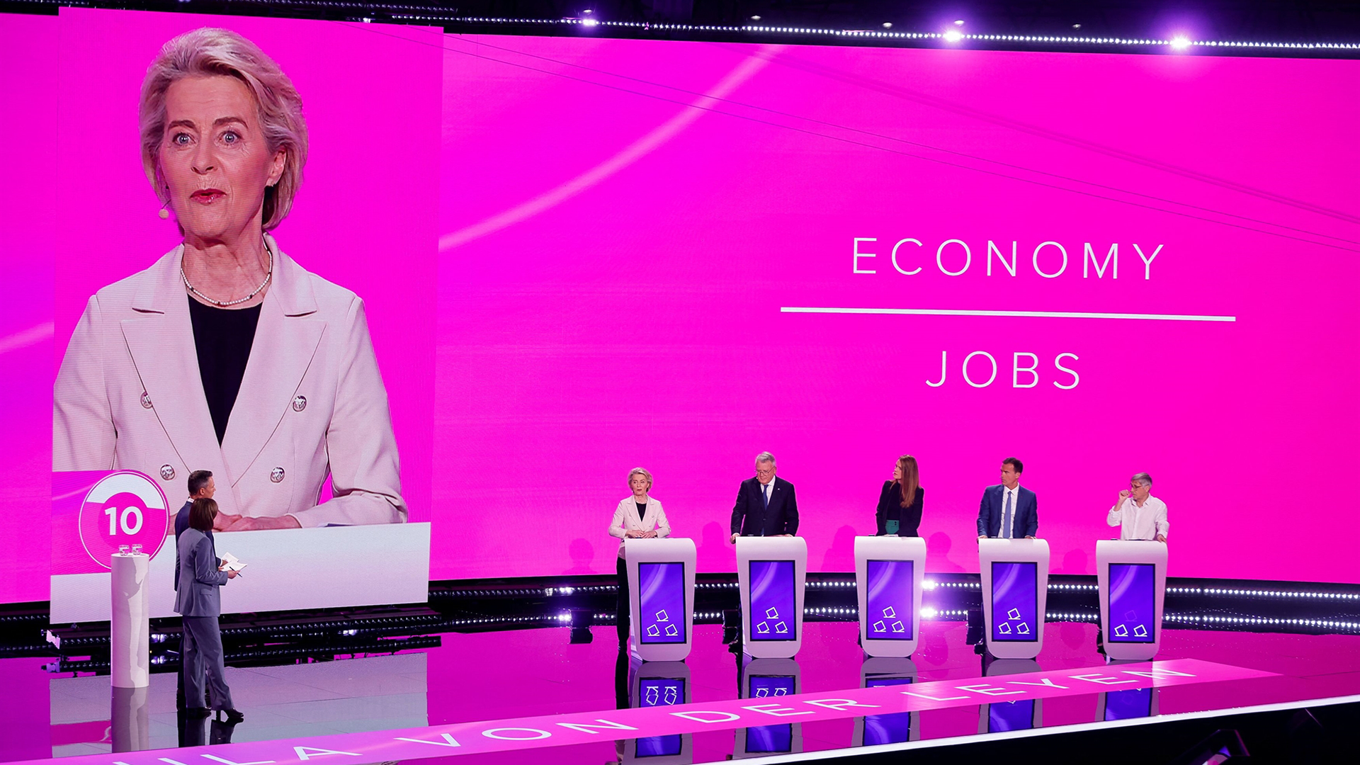 Στη σκηνή που στήθηκε από την Ευρωπαϊκή Ραδιοτηλεοπτική Ενωση (EBU) στο ημικύκλιο του Ευρωκοινοβουλίου, η επικεφαλής υποψήφια του Ευρωπαϊκού Λαϊκού Κόμματος (ΕΛΚ) Ούρσουλα φον ντερ Λάιεν ήταν κατά σειρά πρώτη, ανάμεσα στους πέντε, που επιχείρησαν σε διάφορα σημεία να τη «στριμώξουν» σε σχέση με τις προθέσεις του κόμματός της να συνεργαστεί με την ευρωομάδα του ECR, όπου ανήκει το κόμμα της Ιταλίδας πρωθυπουργού Τζόρτζια Μελόνι, αλλά και ακροδεξιά κόμματα όπως το ισπανικό Vox, καθώς και το υπερσυντηρητικό πολωνικό PiS, που οδήγησε τη Βαρσοβία σε σύγκρουση με τις Βρυξέλλες για το κράτος δικαίου.