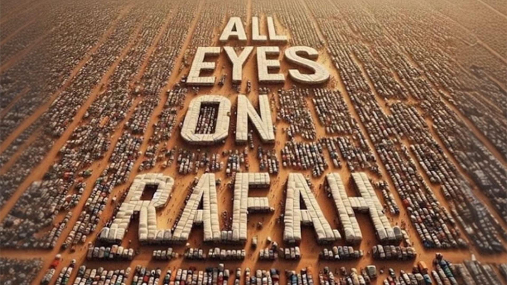 Η εικόνα δείχνει εκατοντάδες, πανομοιότυπες σκηνές προσφύγων, καταλλήλως στοιχισμένες, ώστε να σχηματίζουν τη φράση «all eyes on Rafah», «όλα τα βλέματα στραμμένα στη Ράφα», με φόντο χιονισμένα βουνά.