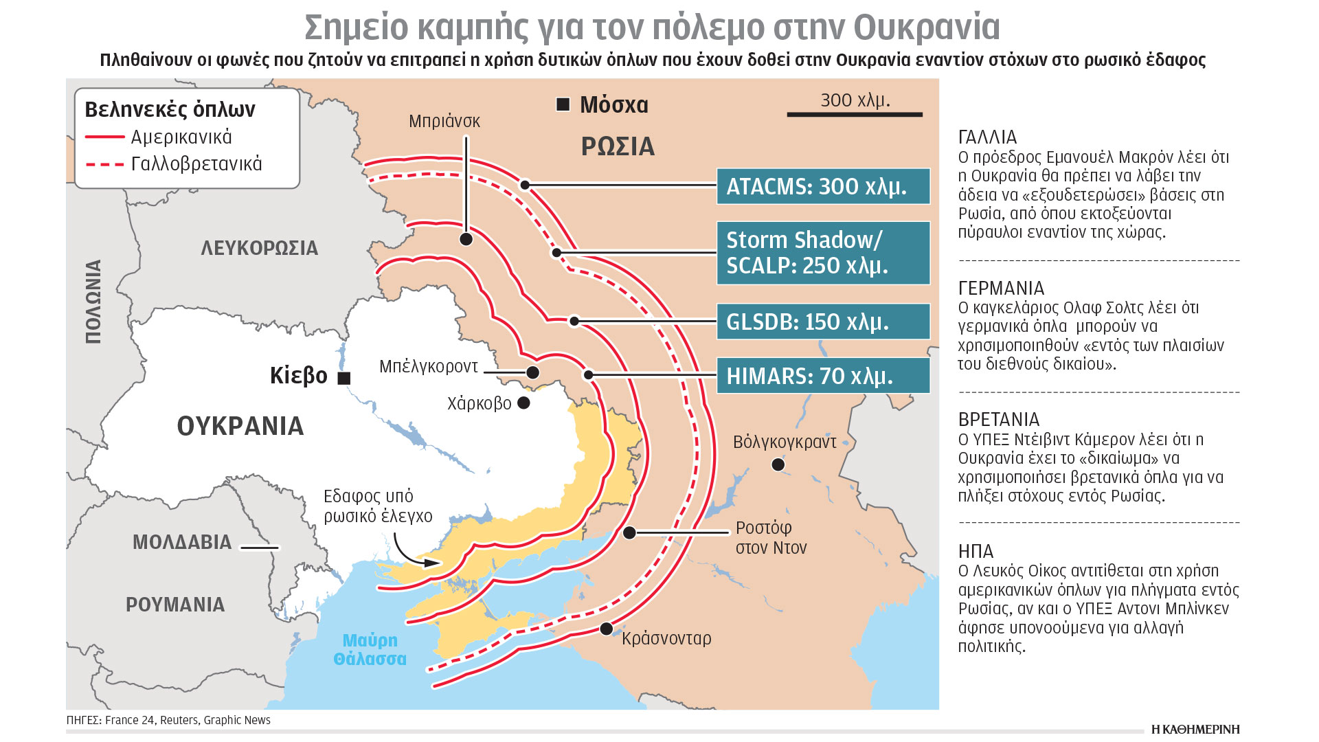Η άρση των περιορισμών χρήσης των νατοϊκών οπλικών συστημάτων, πάντως, αποτελεί «σημείο καμπής», καθώς έως τώρα η Ουκρανία αναγκαζόταν να πολεμήσει με το ένα χέρι επί της ουσίας δεμένο πίσω από την πλάτη, την ώρα που η Ρωσία προκαλούσε τεράστιες ανθρώπινες απώλειες και καταστροφή κρίσιμων υποδομών. Το «πράσινο φως» που έδωσαν Γαλλία και Βρετανία να χρησιμοποιηθούν τα πυραυλικά τους συστήματα εναντίον ρωσικών αεροπορικών βάσεων, ραντάρ και μονάδων αποθήκευσης πυρομαχικών στη μεθόριο, θα αναγκάσει τη Μόσχα να αποσυρθεί στην ενδοχώρα, όπως συνέβη και με το πολεμικό της ναυτικό στη Μαύρη Θάλασσα. Στο μεταξύ, με γοργούς ρυθμούς προχωράει η πρωτοβουλία της Τσεχίας για συγκέντρωση πυρομαχικών και συνολικά ενός εκατομμυρίου οβίδων για το Κίεβο.