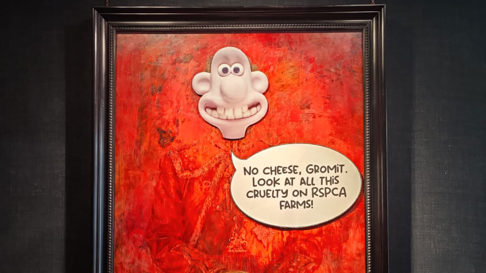 Στα πλάνα που έδωσε στη δημοσιότητα η οργάνωση Animal Rising, δύο ακτιβιστές φαίνονται να κολλούν αυτοκόλλητα των ηρώων κινουμένων σχεδίων, Γουάλας και Γκρόμιτ, πάνω στο προστατευτικό τζάμι του πορτρέτου, σε μια κίνηση διαμαρτυρίας για τις συνθήκες διαβίωσης των ζώων στις φάρμες.
