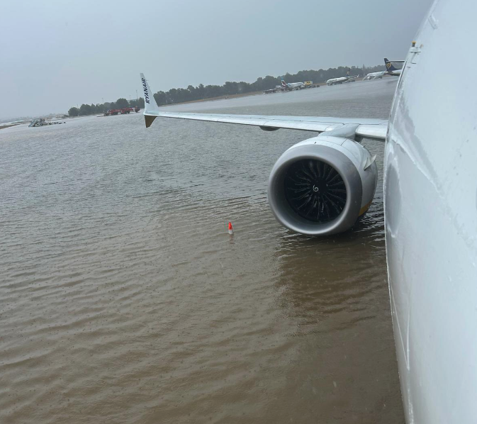 Βίντεο που αναρτήθηκαν στο Χ δείχνουν νερό να πέφτει από το ταβάνι στον χώρο όπου βρίσκονται τα καταστήματα του αεροδρομίου, μουσκεμένους ταξιδιώτες με καλοκαιρινά ρούχα και κουβάδες τοποθετημένους στο πάτωμα. Σε άλλα πλάνα, αυτοκίνητα προσπαθούν να διασχίσουν το πλημμυρισμένο πάρκινγκ. Το πρακτορείο Reuters δεν ήταν σε θέση να επαληθεύσει τα πλάνα.