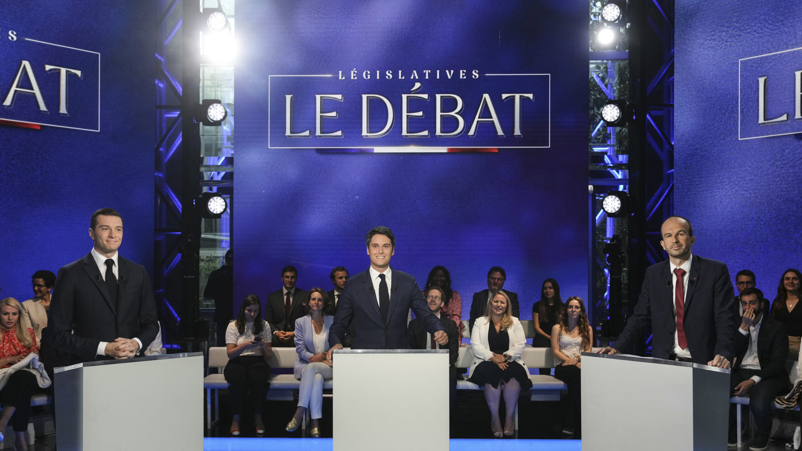 🇫🇷 🗳️ Days ahead of the first round of #France‘s #parliamentary #elections, Prime Minister #GabrielAttal, National Rally (#RN) president #JordanBardella and #left-wing MP #ManuelBompard went head-to-head Tuesday in a televised #debate.