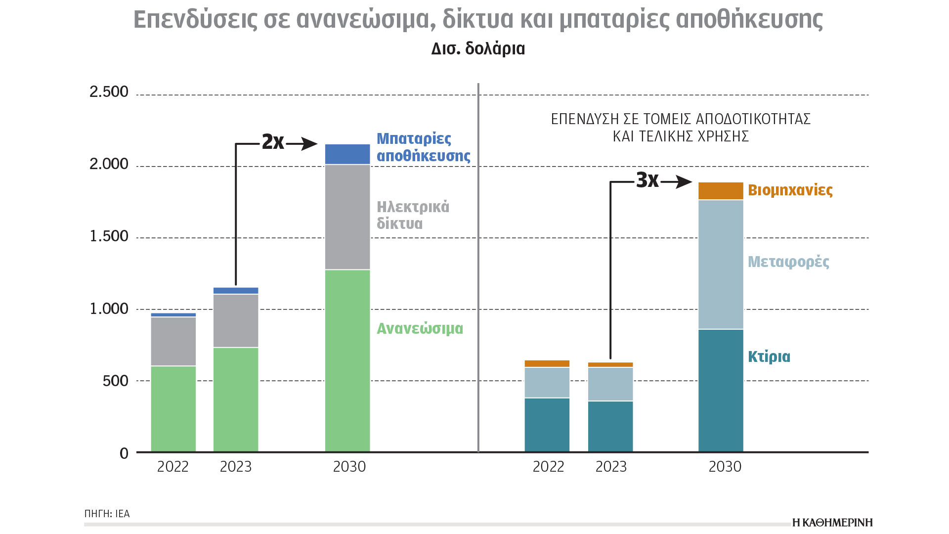 Για την επίτευξη του στόχου των μηδενικών εκπομπών έως το 2030, απαιτείται τριπλασιασμός της παγκόσμιας δυναμικότητας ανανεώσιμων πηγών ενέργειας, ενίσχυση και βελτίωση των ηλεκτρικών δικτύων –που είναι και το μεγαλύτερο ευρωπαϊκό «αγκάθι» στην πορεία προς την πράσινη μετάβαση– και γρηγορότερη ανάπτυξη μπαταριών, με διπλασιασμό των επενδύσεων στους τομείς αυτούς (καλύπτοντας επενδυτικό κενό 1 δισ. δολαρίων από το 2023). Ενώ για τον διπλασιασμό της αποδοτικότητας σε κτίρια, βιομηχανίες και μεταφορές, απαιτείται επιπλέον τριπλασιασμός των επενδύσεων (καλύπτοντας επενδυτικό κενό περίπου 1,3 δισ. δολαρίων).